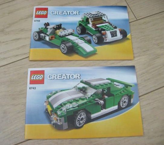| レゴの家と車の説明書のみです。赤い家の説明書は3種類作り方が載っています。緑の車は、一冊には1種類ともう一冊の方は2種類の作り方が載っています。パラパラと見ました。見ながら作ってないので、折り目などは付いてないです。 |