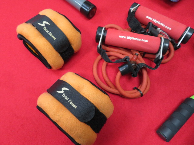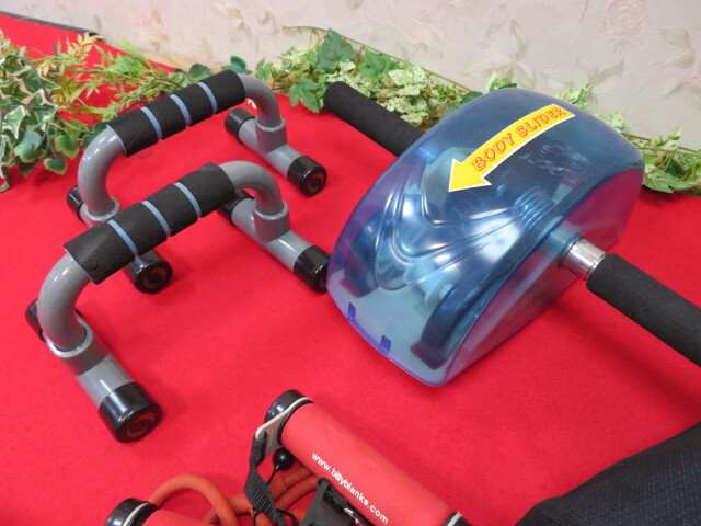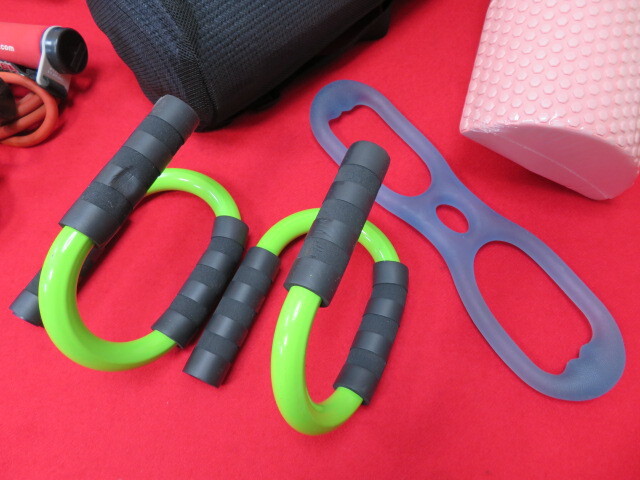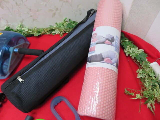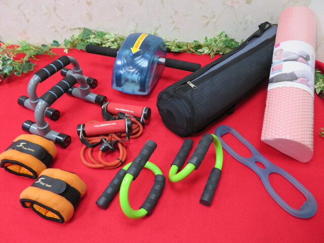 エクササイズ用品 筋トレグッズ8点まとめてセット ポール/マット/腹筋ローラー/プッシュアップバー/チューブなど