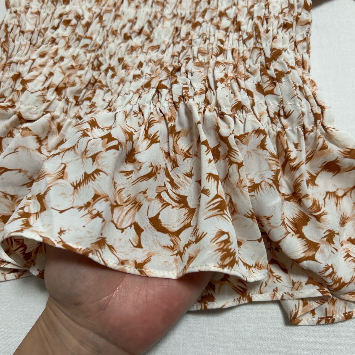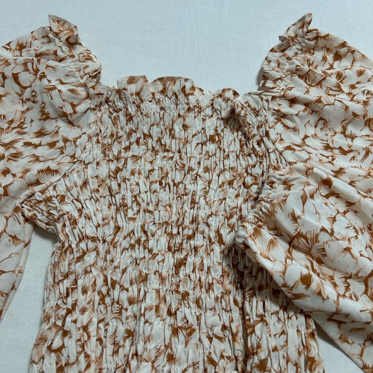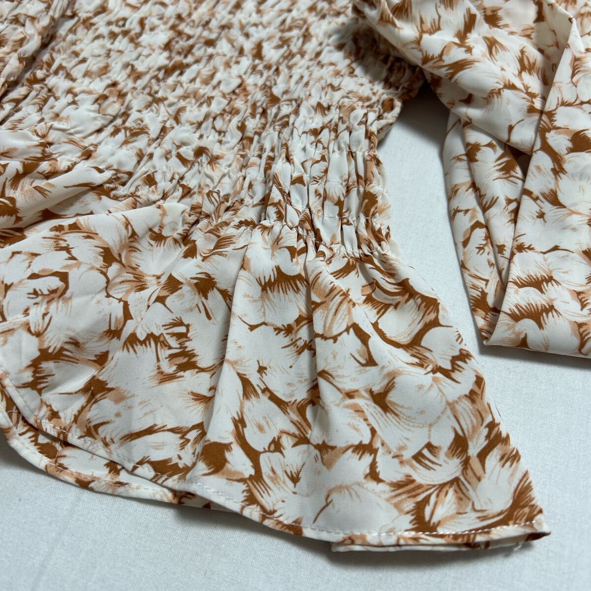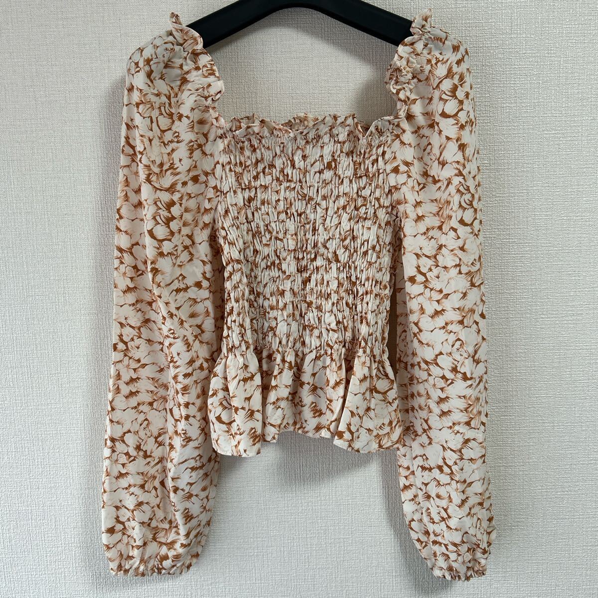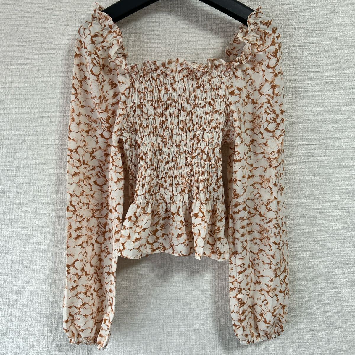 ホワイトとブラウンの花柄が特徴的な長袖シャーリングブラウス。 - 色: ホワイト×ブラウンの花柄 - デザイン: シャーリングデザイン、フリル付き袖 - スタイル: 長袖、ぺプラムシルエット - 素材: 軽量で柔らかい生地 - 袖の特徴: ふんわりとしたボリューム袖 着丈34、身幅30、衿ぐり〜袖口55センチ。 試着程度で良品です。 ご覧いただきありがとうございます。