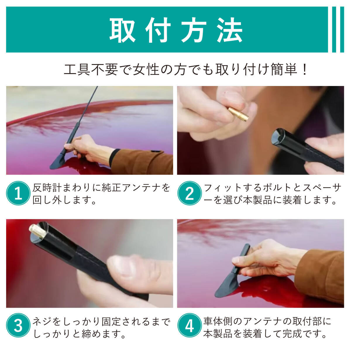| 注意事項 | 1.受信感度はなるべく純正同等となるように設計されておりますが、 長さが短くなる為 地域や場所によっては受信しにくくなる 場合がございます 2.あくまでファッションをメインとした商品としてご理解の上ご使用ください いつでも元に戻せるよう純正アンテナは必ずお手元に保管ください 3.車種別で販売しておりますが、汎用品としてもサイズがあえば 他車種にも装着可能です 4.グレード 特別仕様車 オプション等で適合しない 車種もございます。 事前に現車確認をお願い致します (ドルフィンアンテナや純正伸縮アンテナは不可) 5.ご購入前に必ず、お車のアンテナやその土台、ネジの直径などを ご確認いただき掲載画像の商品と見比べたうえで、 ご購入をお願い致します 6.購入後の装着不可等のクレームに関しては責任を負いかねます ので予めご了承ください 7.お客さま都合による適合の相違、品番の相違といった理由による 返品交換は行っておりません 8.取り扱い商品は新品です 初期不良以外の返品および交換はご容赦ください 万が一商品違い・運送中破損等が起きた場合には、商品到着後 1週間以内に ご連絡ください 9.当商品は海外製の市販品となりますので、純正クオリティ同等や 日本製同等ではございません。予めご了承ください |
