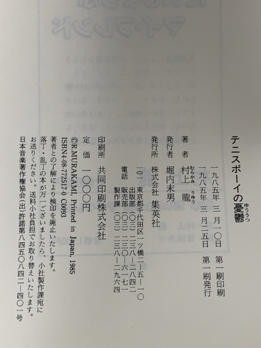 テニスボーイの憂鬱 集英社 村上龍 | ||||