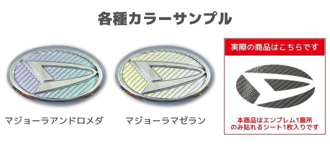 | 【 ここがポイント 】 ★見る角度により色目が変わって見える不思議な「マジョーラカラー」で、アンドロメダとマゼランの2色を設定。 ●本物ならではの奥行きのある美しい3Dのカーボ ン目をお楽しみ頂けます。また、シート自体も耐久性があり、傷が入りにくい商品です。 ●平織りカーボンではなく、見る角度によってその表情を変える綾織りカーボンにこだわっています。 【 商品説明 】 ●ご存知 マジカル・カーボンでおなじみのハセ・プロ製。 ●「マジカルカーボン・シリーズ」は炭素繊維素材、及びガラス繊維素材を特殊技術により柔軟性をもたせた国際特許申請済み の純国産の高級カーボンです。 ●素材の輝きと光沢を放ちつつ、カーボンの立体感・質感が味わえ、高級感を醸し出しながらエレガンスに仕上がります。 ●裏面が両面テープになっており、エンブレムを外さず、そのままシートを貼り付けて装着できます。