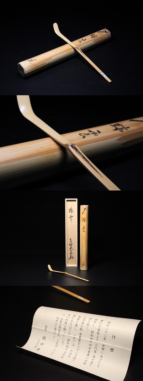 商品説明 | 状態 : 無傷 まだ新品のシールが付いたままのお品です。 節に竹の景色があり、銘も使いやすく季節問わずお使いいただけます。 お稽古からお茶会まで幅広く活躍できると思います。 中々お目に掛かれないと思いますので、この機会に是非如何でしょうか。 幅 1.0cm 寸法 : 長さ 17.9cm 箱 : 共箱 栞付 |