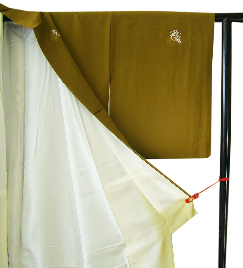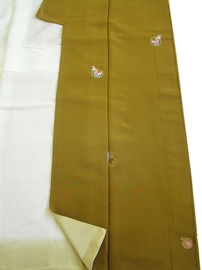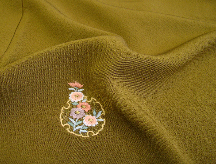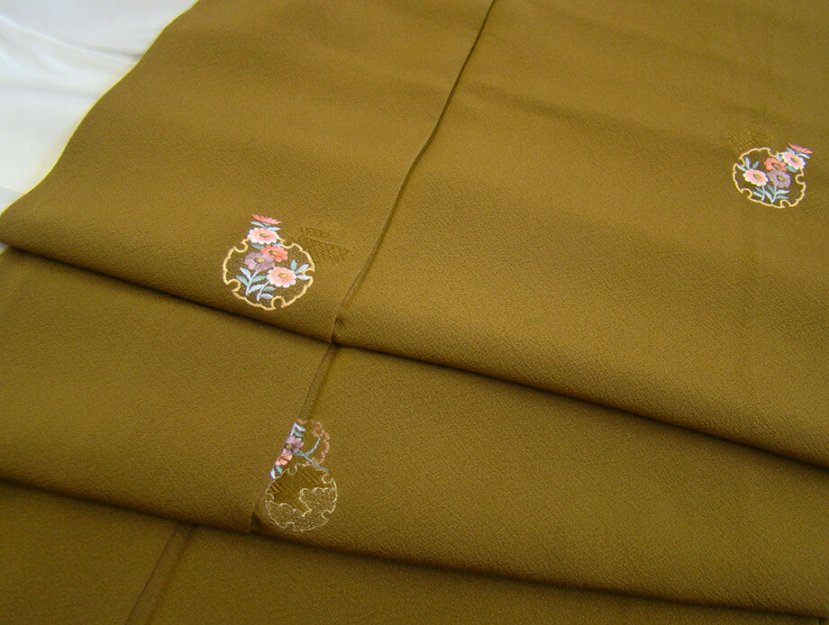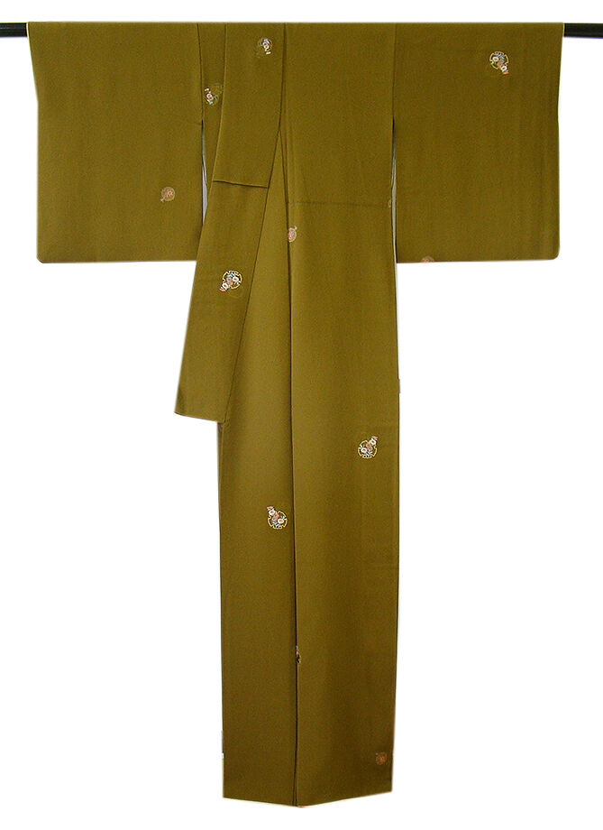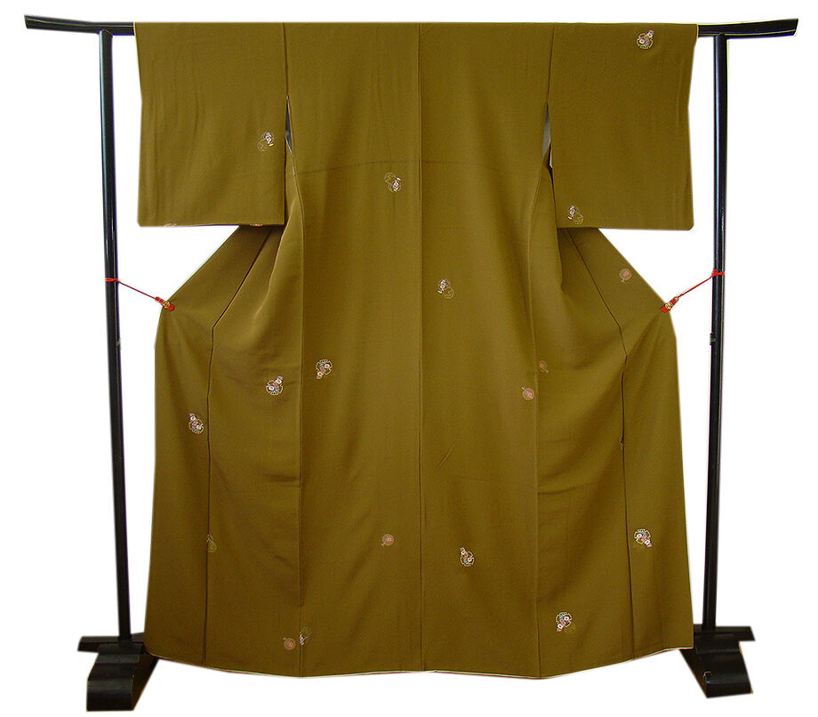 商品説明 | こちらのお品は「袷」ですので10月から5月までお召頂ければと思います。 とてもしなやかな手触りの着心地良い重めの滑らかな極上ちりめん地の生地、 鶯茶色地に雪輪文に花草柄の刺繍柄、 八掛は蒸栗色(正絹)、幅広い年代の方にお召頂けます。 |