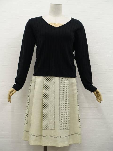 | 長袖 ニットカットソー+キャミソール+ひざ丈 ボックスプリーツスカート コーディネート上下3点セット M相当 ブラック/ペールオレンジ/アイボリー地 ブラック ドット柄 フェミニン系 20代