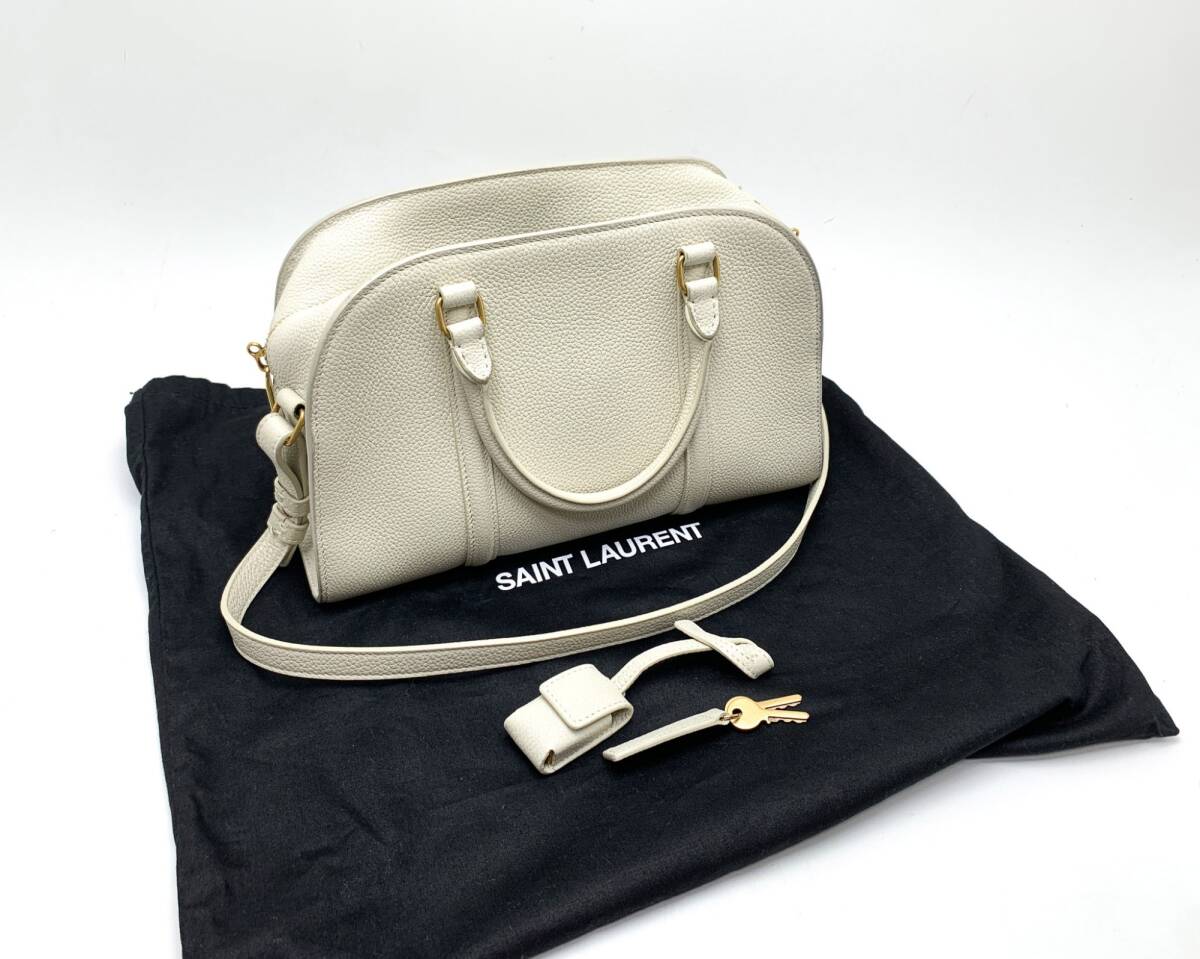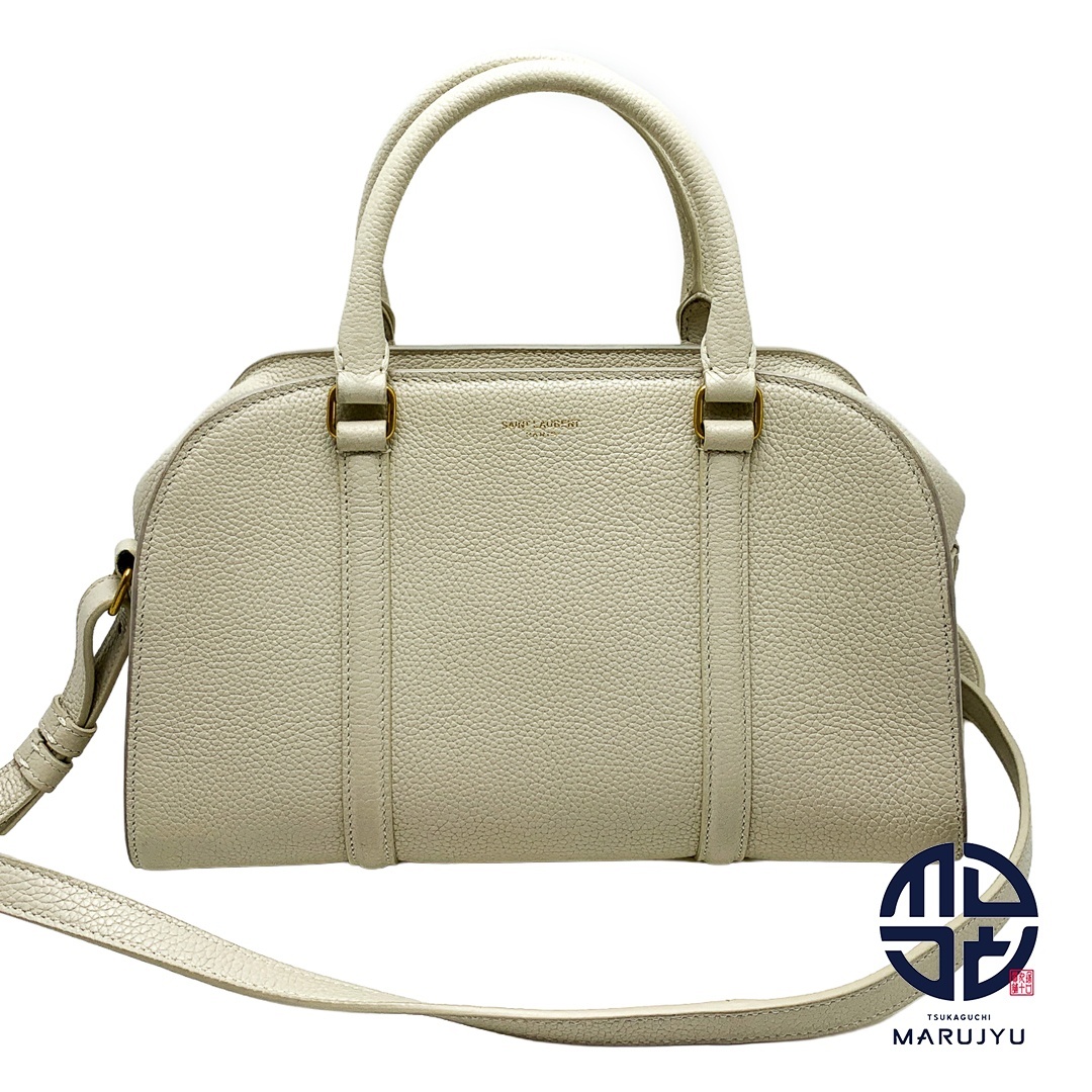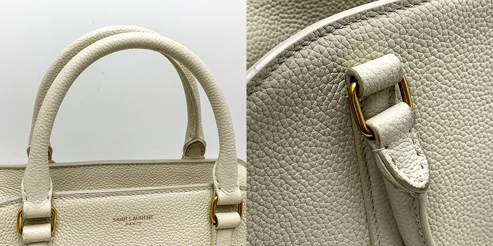 | サンローランより、ダブルロックバッグになります。グレーがかったホワイト系のお色です。真っ白ではないので、お洋服にも馴染みやすいカラーです。ショルダーストラップは斜め掛け可能です。ABランク。バッグのコバ回りに汚れ、持ち手コバ回り汚れあり。少々角擦れ・汚れございます。持ち手金具回りやや擦れがございますが、まだまだお使いいただける比較的綺麗なお品です。 | |