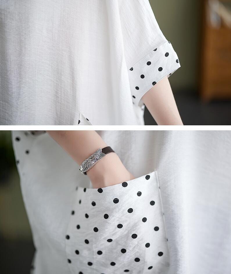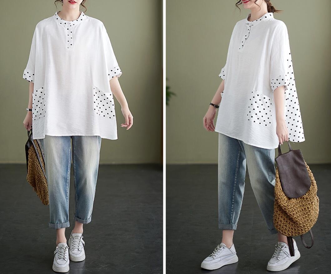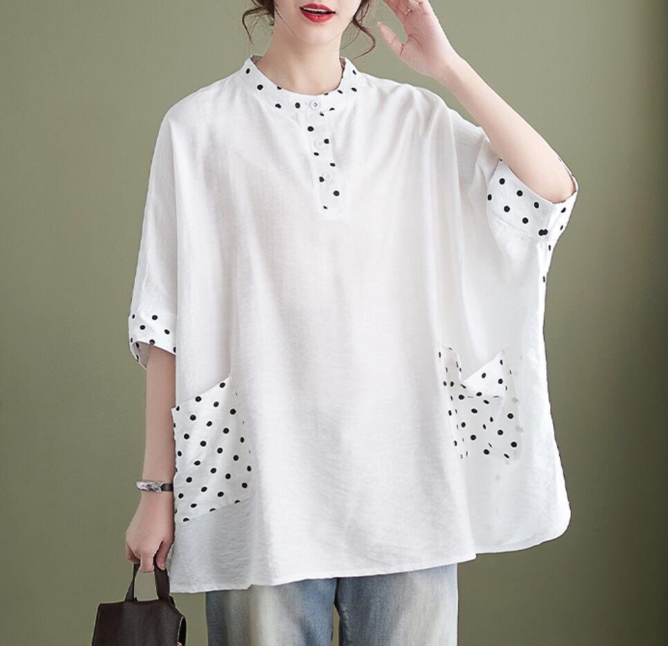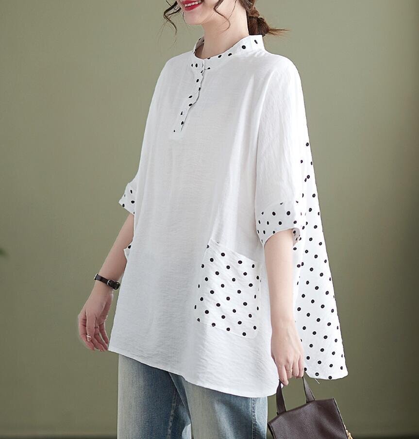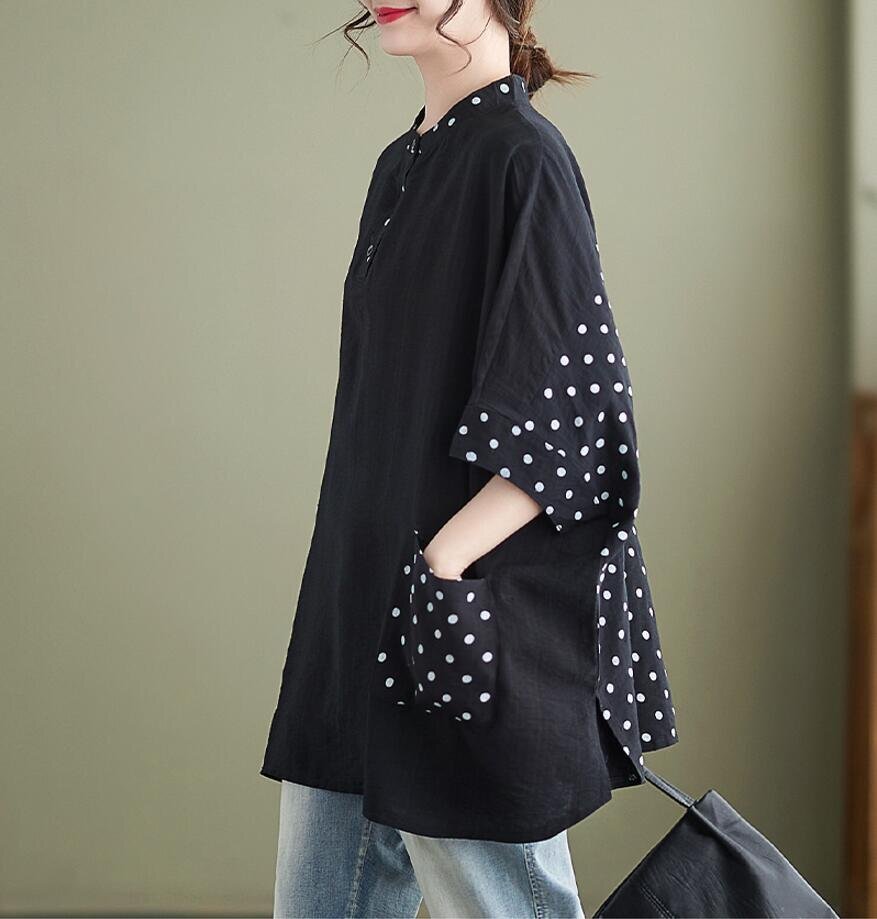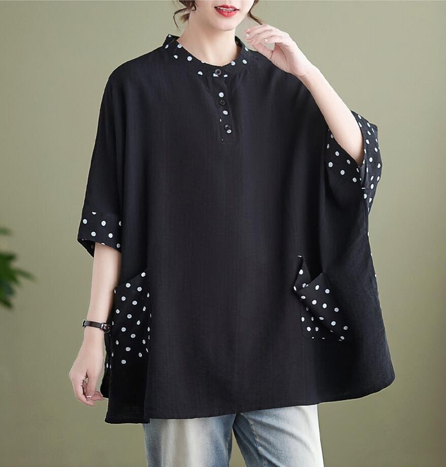 夏新品 チュニック シャツ レディース ドット柄 切り替え カジュアル 大きいサイズ 半袖 トップス★黒/Lサイズ [浏览原始页面]