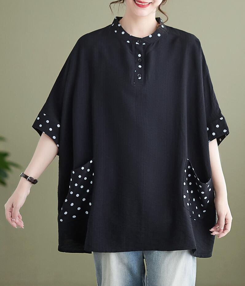 夏新品 チュニック シャツ レディース ドット柄 切り替え カジュアル 大きいサイズ 半袖 トップス★黒/Lサイズ