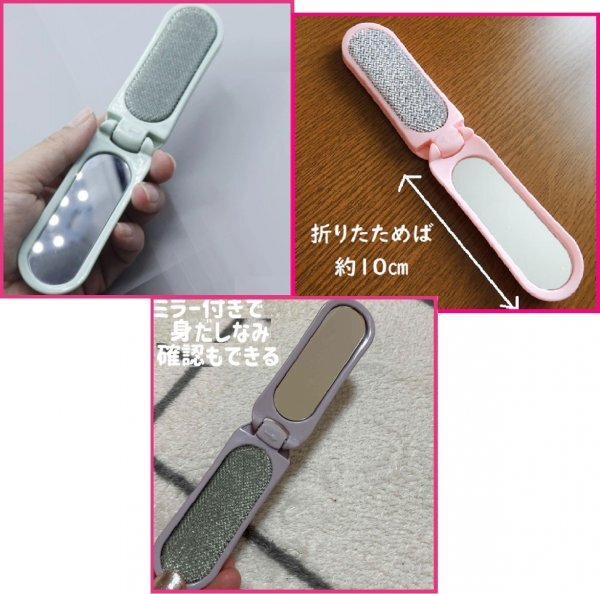 ・サイズ:長さ:18.5cm(開いた状態)、 9.5cm(閉じた状態) (洋服ブラシ:ミラー付) ・携帯なので持ち歩きいつでもどこでも、簡単に埃やペットの毛等を取ることが できるブラシです。 ・エチケットブラシは、布の表面に付いた糸くずやほこりをキレイに取り除いて くれるとっても便利な道具です。 ・お洋服を傷めずに取り去ることができるので、生地の長持ちにもつながります。 ・粘着テープと違い使い捨てでは無いので節約にもなりますね。 (ホコリ取りブラシ 毛玉取り 洋服ブラシ 静電除去服ブラシ 髪の毛 ペット 衣類 ソファー ほこり取り お掃除 お手入れ 毛取り ブラシ) ・新品/未使用 ★★ お得情報 ★★ :いろいろなセット準備可能です。 (入札前に、ナビにてご質問して頂ければご対応いたします) ・気になるところがありましたらご質問してください。 (デザイン等が多少変更になることが御座います) (パッケージ・台紙等が簡易的になることがご座います) (色はおまかせとなることがございます) ・他にも出品予定ですのでご覧下さい (^-^)。 まとめていかがでしょうか。 ・それではよろしくおねがいします。 | |||
