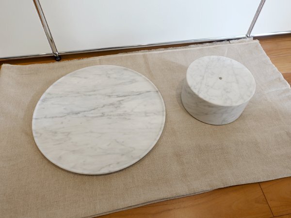 ご覧いただきましてありがとうございます。 ピエロ・リッソーニが「8(OTTO)」ソファのアクセサリーとしてデザインした、カッシーナのテーブルシリーズ「9(NOVE)」。 https://www.cassina-ixc.jp/nove こちらは同商品の、大理石製の「天板」と「台座」の出品です。 製品の一部を出品をするもので、天板と台座をつなぐ支柱やボルトの類いはございません。 ホワイトカラーラ材、天板の直径は40cmです。 大理石が割れてしまった方や、すでに同じ製品をお持ちの方は、カラー(素材)チェンジなどにいかがでしょうか。 コンディションですが、使用感や目立つキズもなく、たいへん良好です。 天板裏面のボルト穴付近に少しテカリがございますが、おそらく製造時よりあるものかと思います。 台座の天面の一部に、表面の磨きがかかっていない部分がございます。光を当ててみるとわかる程度のもので、製造時からこのような状態です。 メーカーロゴやタグの類いは、もともと付いていない製品です。 支柱を含めた完品での定価は385,000円(税込)と高額な製品です。 |