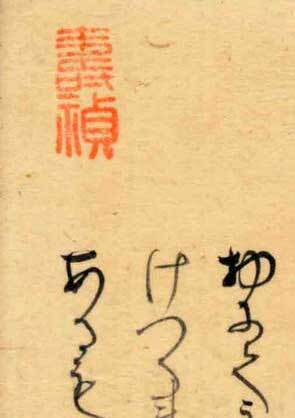 「関屋(せきや)」原本自筆上部には、「今愁古恨入絲竹」《今の愁(うれ)い古(いにしえ)の恨み糸竹(しちく)に入る》という漢文の篆書印が押捺されている。言葉の意味は、「今人の愁い、古人の悲しみ、楽の音に籠(こも)る」という内容です。