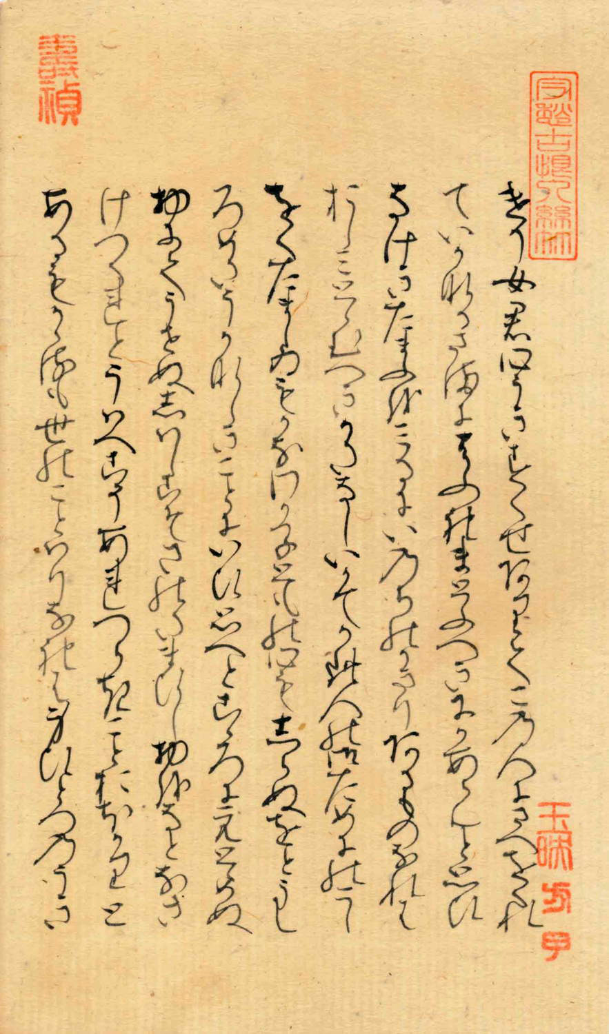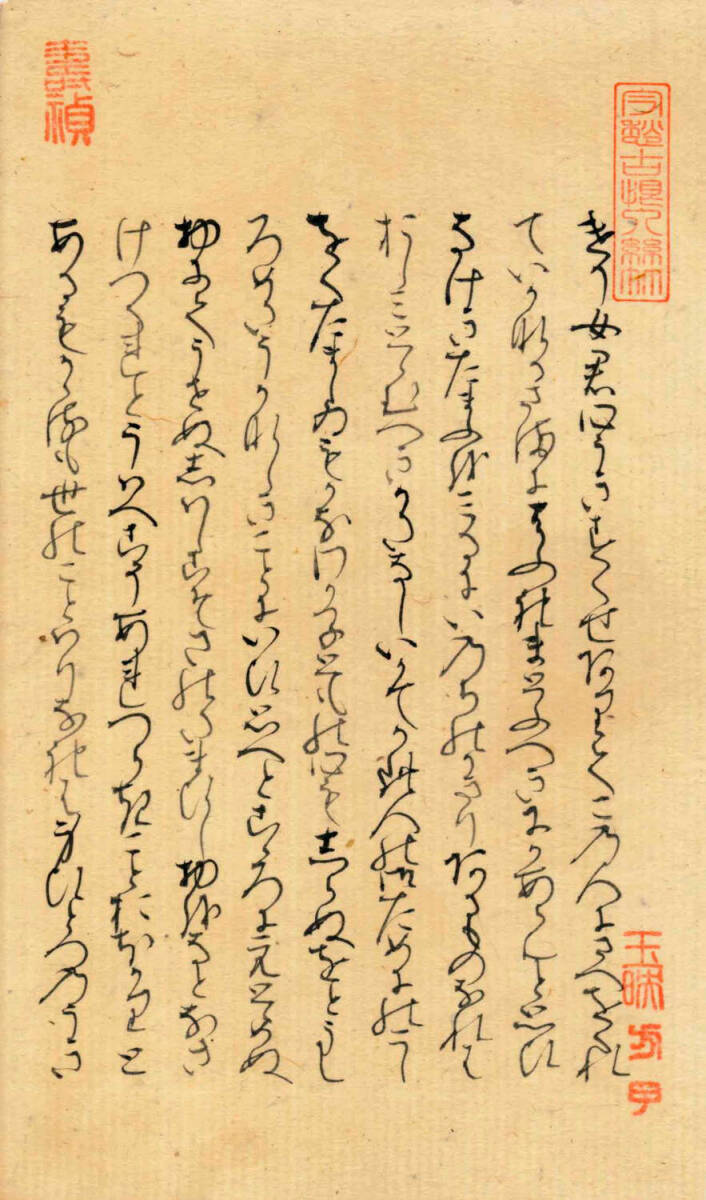 「関屋(せきや)」原本自筆上部には、「今愁古恨入絲竹」《今の愁(うれ)い古(いにしえ)の恨み糸竹(しちく)に入る》という漢文の篆書印が押捺されている。