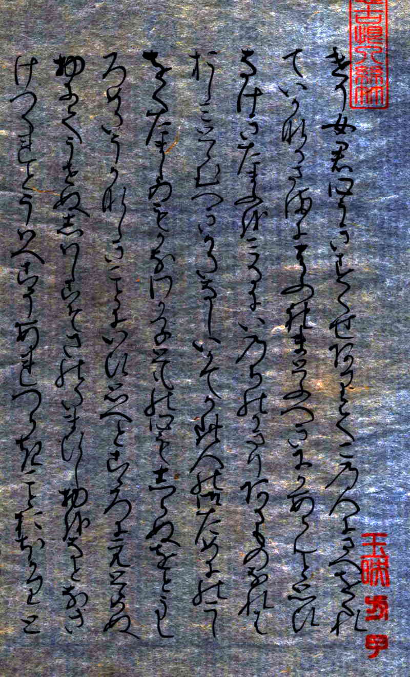 「関屋(せきや)」原本自筆上部には、「今愁古恨入絲竹」《今の愁(うれ)い古(いにしえ)の恨み糸竹(しちく)に入る》という漢文の篆書印が押捺されている。言葉の意味は、「今人の愁い、古人の悲しみ、楽の音に籠(こも)る」という内容です。紫式部がこの原詩に親しんでいたことがわかる。