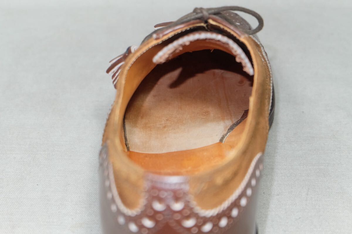 この度はアクセスありがとうございます。 今は亡きイギリスの歴史ある名門シューズファクトリーTECNIC社が製作したCHRIS SPENSERの希少なヴィンテージシューズで革質、作り、デザインすべてが上質でハンドメイドが細部に多く残る極上のフルブローグオックスフォードコンビシューズになります。アッパーは永い時間をかけて丁寧になめされた美しく深い艶のある当時の最高級カーフレザーとしなやかで質のよいスエードレザーを使用し、美しいフルブローグのパターンで仕立てています。木型も近年のものよりも明らかに美しい曲線と立体感があり、英国的な色気を感じます。ソールはイギリス伝統のコマンドラバーソールを使用して悪路にも対応し永くご使用いただける作りになっております。全体的な縫製のステッチも細かく美しく、出し縫いも丁寧に仕上げられております。もちろん英国の伝統的な作り込みですので、ソール交換も可能で堅牢なGoodyearWelted製法で丁寧に仕上げられております。またライニング、インソール(中底)とすべてが質の良いレザーを用いたイギリスの伝統とエレガントが詰まった仕上がりとなっており、繊細なステッチ、クラシックなパターン、美しくエレガントな木型などヴィンテージシューズならではの古き良き美が詰まった極上の1足です。 ヴィンテージシューズ、旧チャーチ、ジョンロブ、オールデン、サンクリスピン、ステファノベーメル、ガジアーノ&ガーリング、JMウェストンなど質実剛健な本格靴がお好きな方からユーロ、アメリカのヴィンテージファッションがお好きな方にもオススメです。この機会にぜひご検討よろしくお願いします。 サイズ:UK7.5E(約26.5cm) 型:フルブローグオックスフォード、ウィングチップ アウトソール:30cm ソール最大幅:11.2cm ソール:コマンドソール カラー:ブラウン 製産国:イギリス 素材:カーフレザー×スエードレザー ライニング:レザーライニング 状態:10段階中【7.5】 アッパー:まだまだ永くご使用いただける美品です。 ソール:まだまだ永くご使用いただける美品です。ヒールのラバーが少し削れております。純正でしたのでこのまま撮影しておりますが、気になる方は質問、取引時にお伝えいただければ丁寧に修理して対応させていただきます。 付属品:なし 基本的にはノークレームノーリターンなのでご不明点等あればお気軽にご質問、ご連絡ください。 注意事項 確認はしておりますが、中古品のため小さなキズ、汚れ等を見落とす場合があるので神経質な方はご入札をお控えください。 サイズはあくまで標準的なサイズ感なので、実寸やメーカーサイズをご参考頂きますようお願いいたします。 三日以内にご連絡いただけない場合、評価の末再出品させていただきますのでご了承ください。 | |||
