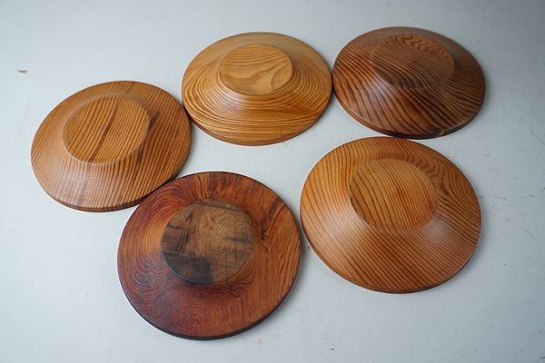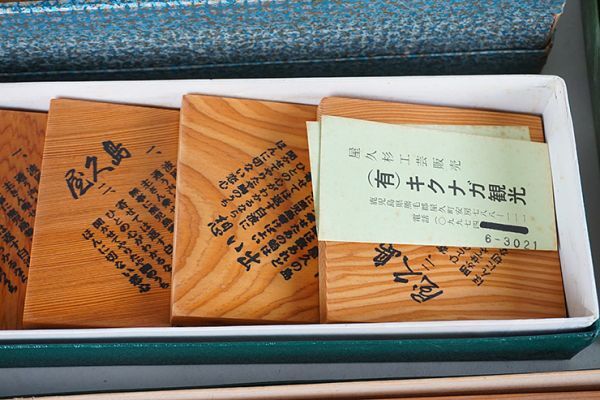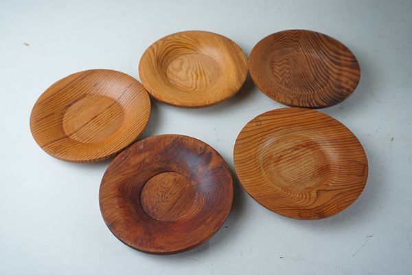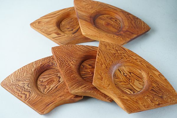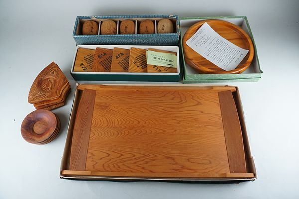 | D-371■屋久杉造り 未使用四方長盆 丸盆 茶托二種 ぐい呑み5客 菓子皿5客 | ||