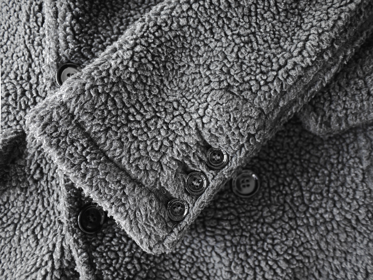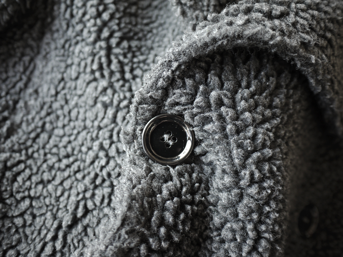 うんわりと柔らかなアクリルウールボアを採用し、しっかりと厚みがありながら柔らかく、保温性、着心地とともに抜群の上質なマテリアルです。深みのあるダークグレーがミニマルで品格溢れるモードなスタイリングを演出いたします。