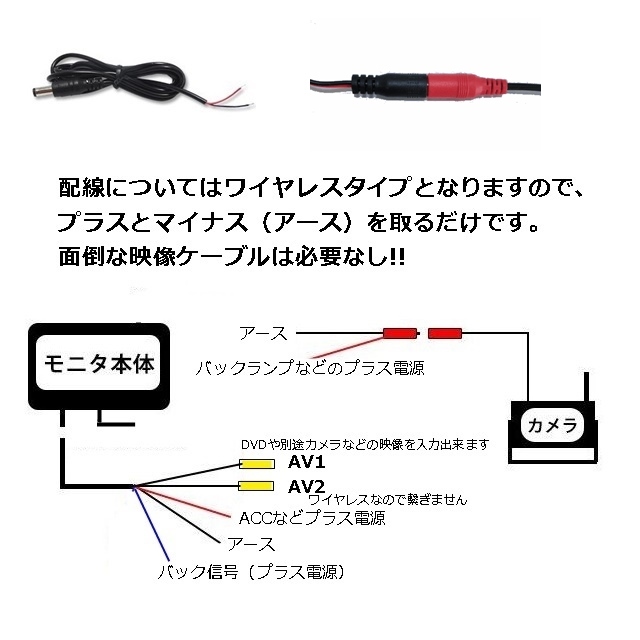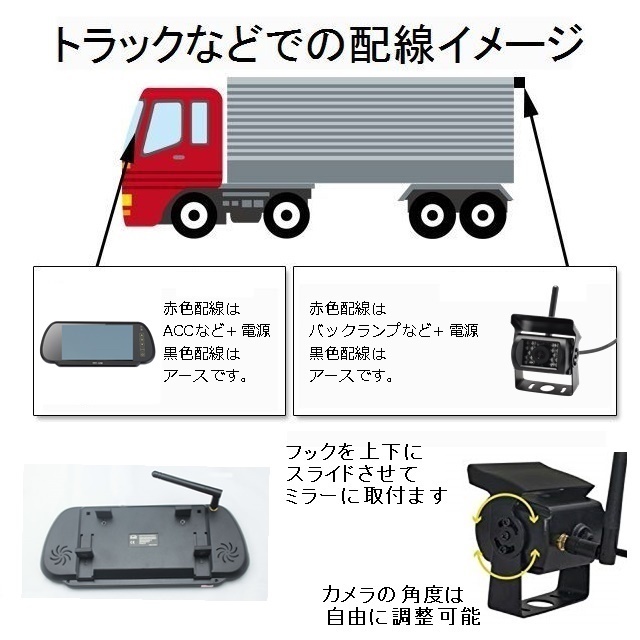 迅速・丁寧に出来る限り進めていきます。どうぞ宜しくお願い致します。 ☆商品特徴☆ これ一台で、トラックなどに取り付け、使い方一つで、作業効率大幅アップ!!もちろん、 自動赤外線切り替付赤外線カメラなので非常に見抜くい夜間でも白黒ですが、映ります。 明るい昼間などは、綺麗なカラー映像で映し出されますので、昼も夜も非常に良く見える優れものです。 しかも今回お客様のご要望にお答えし、24V対応(12Vも使用可能)7インチミラーモニターを出品致します。 皆様、入札宜しくお願い致します。 ☆商品詳細☆ オート電源TFTワイヤレス7インチミラーモニター 液晶サイズ:7インチ カラー:NTSC&PAL(両対応自動切換え) 解像度:800×480×RGBピクセル パネル :TFT-LCD 液晶調整カラー調整、ブライト調整、コントラスト調整、Tint調整 サイズ: 250mm(W)×100mm(H)×20mm(D) 電源:DC24V/DC12V 色:ブラック *こちらのモニターは【オート電源】です ☆・電源ケーブル・リモコン・アンテナ・説明書☆ *オート電源機能:電源オン状態で、ACCを切ると次ACCを入れると電源オン!! *リバース連動機能:付属品の電源映像ケーブルの 青線をリバース検出(バックランプなど24Vあるいは12Vの発生する場所)に繋ぎ込むとリバースに入れると自動で、 AV2に切り替わるシステムです。(バックカメラなどを付けるときに便利な機能です。) 赤外線付きバックカメラ レンズ広角:約120度 画像:NTSC 電源:DC24V/DC12V カメラ:防水防塵 サイズ:75(W)×50(H)×75(D)ミリ 付属品:電源ケーブル、アンテナ ワイヤレスなので楽々取り付け出来ます。 ●36万画像・高画質自動赤外線切り替え、カラー映像バックカメラ 赤外線カメラは、超ー最新型です。 ☆取り付け注意事項☆ ・お取り付けの電気ショートは、十分に注意お願い致します。 ・此方の商品は、DC24Vです。(DC12Vでも使用可能) ・機器破損の原因になりますので、分解はしないでください。(分解による機器破損及び商品の改造・加工は、交換対象外になります。) ・電波の有効距離は約20mとなります。 ・電波は周囲の状況やお取り付け頂く車両の状況などによっては映像にノイズや乱れが生じることがありますので予めご了承ください。 | |