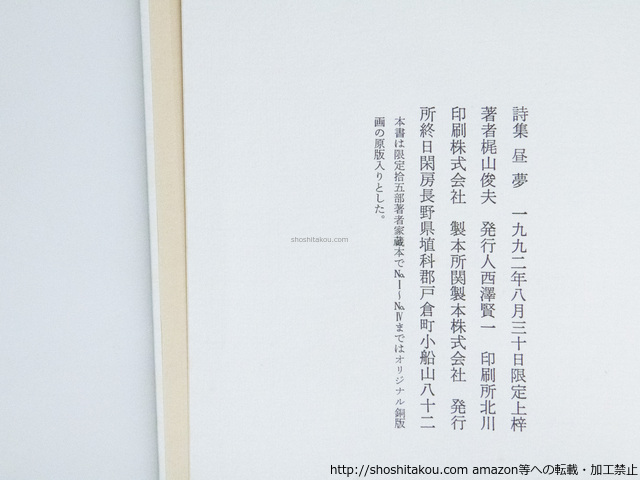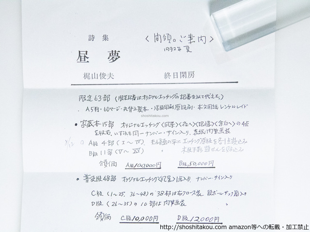 詩集 昼夢 家蔵本A番4部 エッチング原版嵌込夫婦函 肉筆画表紙 サイン・エディション入エッチング4点入 / 梶山俊夫 ◯当店在庫から「梶山俊夫」の本を探す| ★ 発送方法 (送料無料) ・日本郵便のゆうパケット・レターパックライト・レターパックプラス・ゆうパックの中から荷姿の大きさに適した方法で発送します。(発送方法や到着日時はご指定いただけません。) ・上記発送方法はすべて追跡番号付き・土日配送有・速達扱いです。ゆうメールや定形外は発送に使用いたしません。 ・ゆうパケット・レターパックライトは郵便受けにお届け、レターパックプラス・ゆうパックは配達員対面受取です。防水梱包します。 ★ 必ずお読みください ・代金決済後の次の火木土に発送します。 ・ストア出品です。ご注文時に必要事項のご記入・決済いただいた後は、やり取り不要です。商品の到着をお待ち下さい。 ・肉筆物・美術作品は真作保証いたします。 ・商品のレファレンス(調べ物)サービスは行っておりません。また当店商品以外の無料鑑定は行っておりません。 |