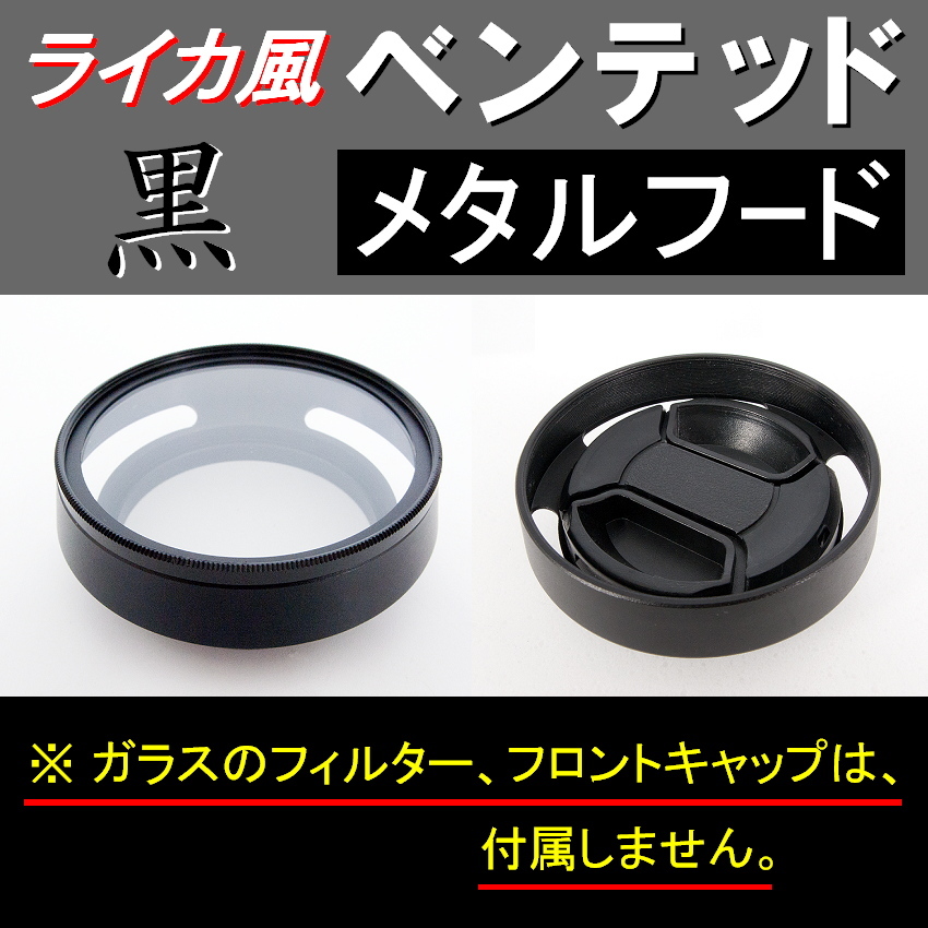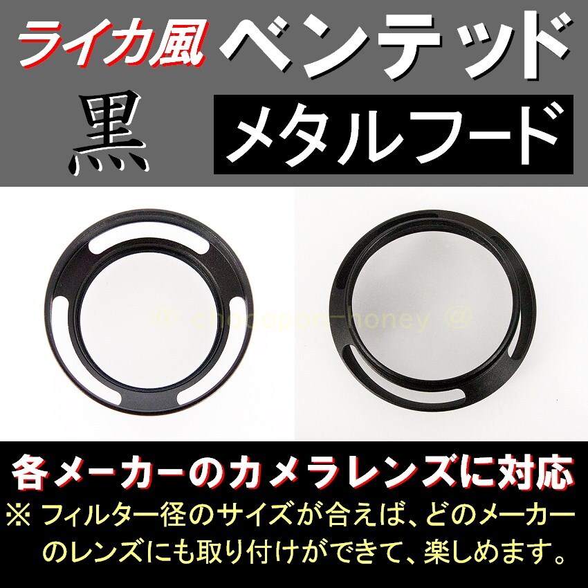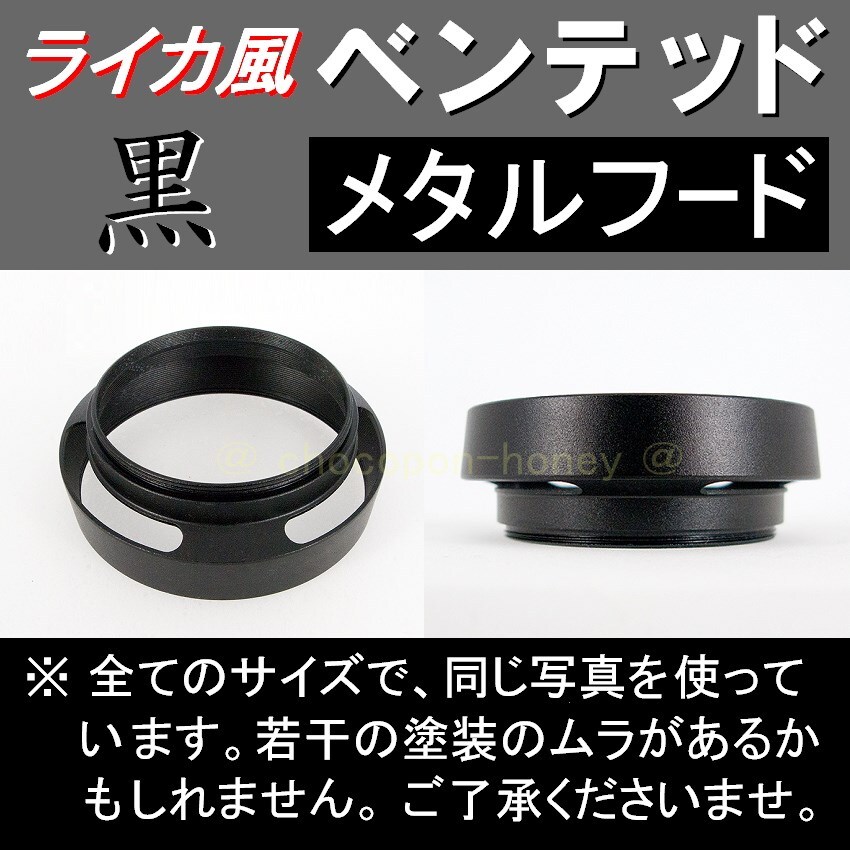 ● 標準レンズ用の、ライカ風ベンテッドフードです。( 通気穴のあるフードの意味です。) 金属製で、カメラ全体の見栄えが素敵になりテンションが上がります。(※ ライカ社の製品ではありません。) ● 4枚目の写真の右側ように、フードの先端が ネジ式になっていて、そこには、フィルター径のサイズ、58mmのアイテム ( UVフィルター、CPLフィルターなど ) を、取り付け可能です。 ● 4枚目の写真の左側のように、「49mmサイズ」のフロントキャップが取付可能です。(※ フロントキャップがある所には、フィルターは取付できません。) ※ UVフィルター、フロントキャップは、付属しません。(※ 別売で販売中!) ※ 新品ですが、ネジ部分など、若干塗装の薄い部分が見える場合があります。ご了承くださいませ。 標準レンズ用の 黒 ( 37 39 40.5 43 46 49 52 55 58 62 67 72 77 mm) 標準レンズ用の 銀 ( 37 39 40.5 43 46 49 52 55 58 mm) 広角レンズ用の 黒 ( 37 39 40.5 43 46 49 52 55 58 62 67 72 77 mm) 広角レンズ用の 銀 ( 37 39 40.5 43 46 49 52 55 58 62 67 mm) ※ 写真は同じものを、使っています。デザインの一部に変更がある場合がございます。あらかじめ、ご了承ください。商品に不安のある方、神経質な方は、ご遠慮ください。 | ||