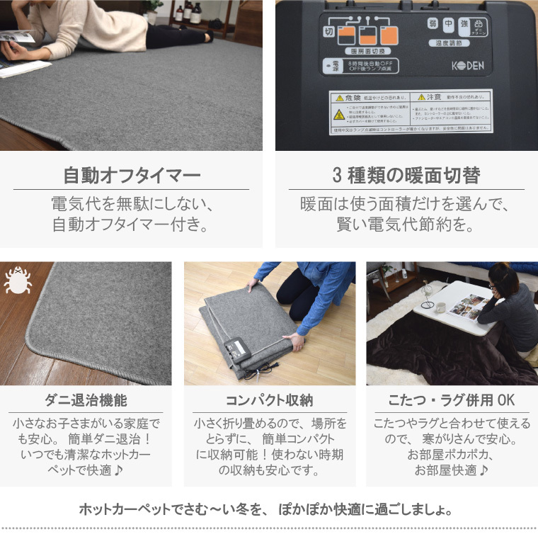 〇仕様 | ホットカーペット仕様 :定格:交流 100V 480W、電源コード:ビニルキャブタイヤコード(VCTFK)・ダニクリーン機能、スライド調節、コンパクト収納自動オフタイマー付き、暖房面切り替え(3面)・室温センサー、省エネモード、保証書付き |