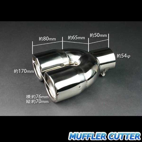 サビに強いステンレス製で丁寧に磨き上げた鏡面加工です。形状は、出口が縦約70mm,横約76mmのオーバル2本出しです。マフラーカッターの出口部分の最大取付幅は約170mmです。