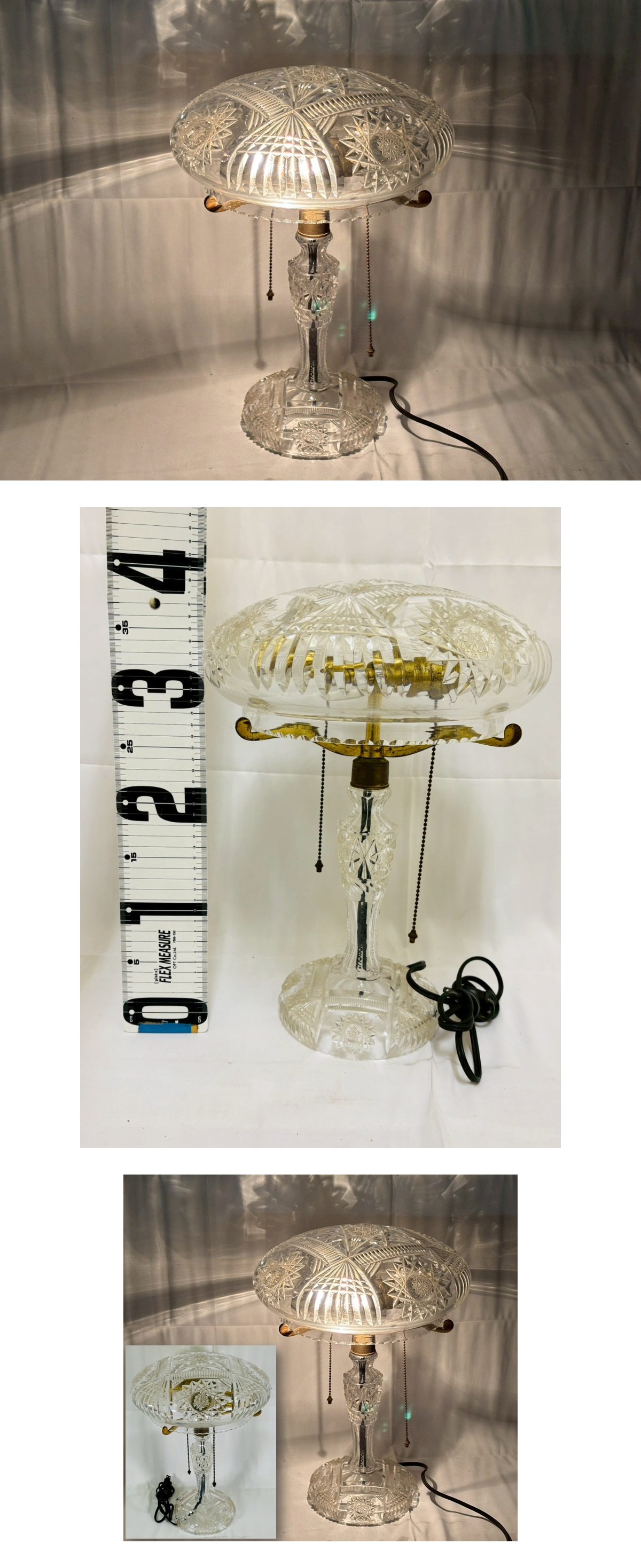 ●【超豪華】アンティーク クリスタルガラス テーブルランプ 2灯式 プルチェーン 西洋 レトロ モダン エレガント 照明 アールデコ調 ■サイズ:直径 31cm/高さ 40cm ■重量: g ※素人寸法の為、若干の誤差はご了承ください。 ■状態につきましては経年に伴うスレ・汚れ・小キズ などが見られます。 ※その他の細かな状態は写真にてご確認・ご了承の上 ご入札くださいませ。 ●こちらの商品などは時代物や古いお品・骨董品となり ますので、細かな状態を気にされる方・神経質な方の ご入札はご遠慮くださいませ。【EIG】 |