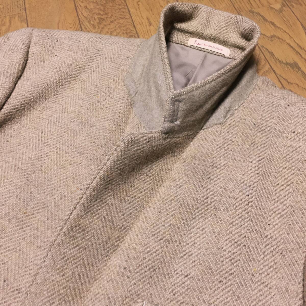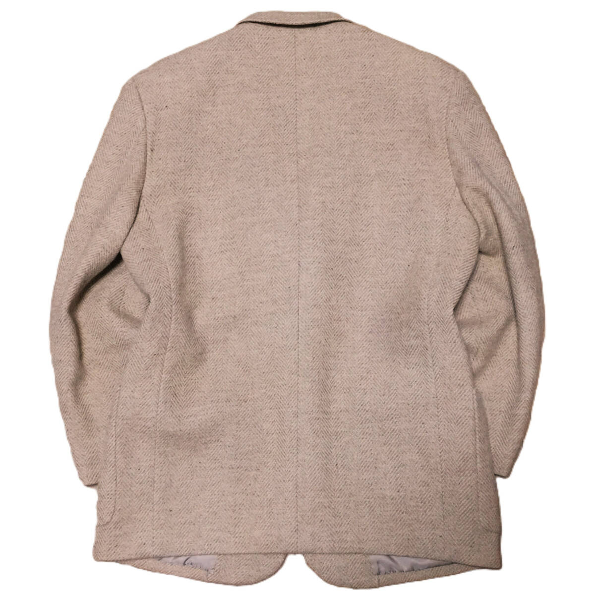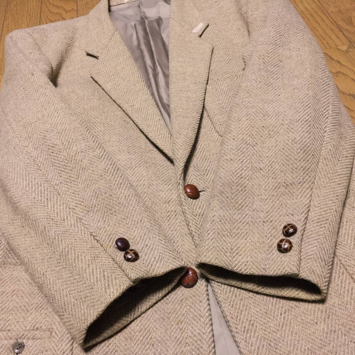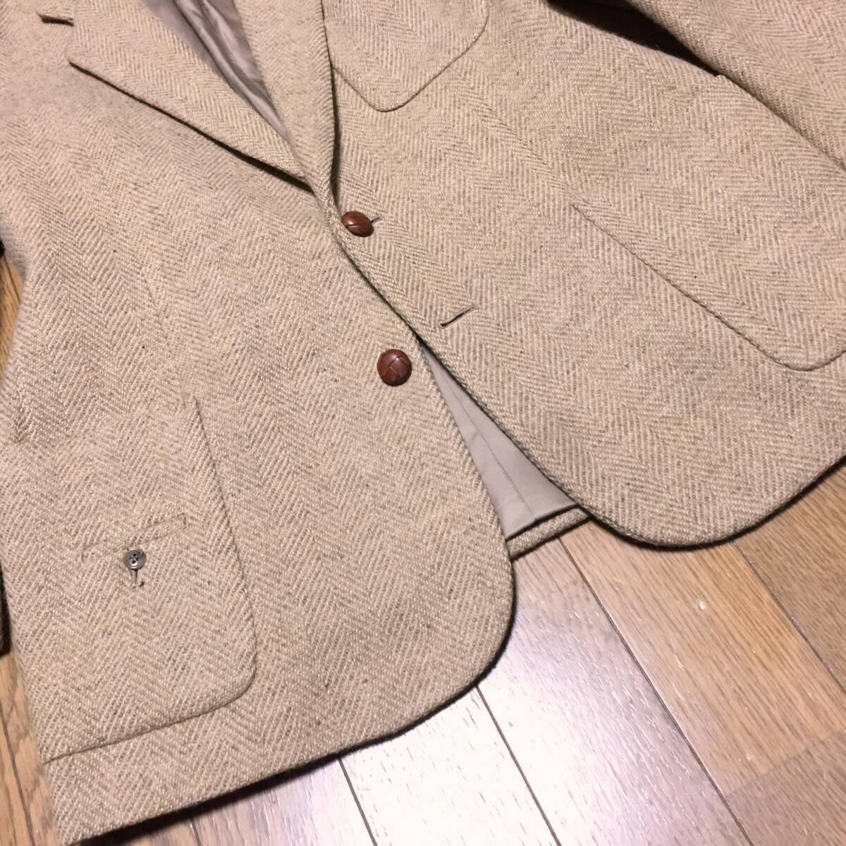 | 【ブランド】 Papas パパス × 英国 SYDNEY H SHAW 【デザイン・モデル】 ヘリンボーン ツイードウール くるみ釦 2B テーラード ジャケット 【生産】 ㈱ビービーケーケー 日本製 【詳細・コメント】 Papas パパス ツイードウール ジャケットです。英国老舗ファブリックメーカーSYDNEY H SHAW社の高級PURE NEW WOOL(ピュアニューウール)を100%使用したヘリンボーン織りツイード生地で仕立てた、クラシカルで温かみのある風合いが魅力の高級感のある逸品。くるみ釦にさりげないラペルのロゴワッペン、裏地のロゴ柄など等細部にまで拘り感じるクオリティの高い仕上がりです。流行に左右されず、雰囲気ある着こなしを演出して頂けます。仕立てはシングル2ボタン、袖口2ボタン、総裏地、ノーベンツです。 正規品です。 【サイズ】 表記: S 44 ※実寸を参考にして下さい。 平置実寸:身幅54㎝ 着丈73cm 肩幅46㎝ 袖丈58㎝ ※多少の誤差はご了承ください。 【カラー・パターン】 ベージュ ブラウン系 ヘリンボーン織柄※ご覧になられるモニターや、デジカメの撮影具合によって色味が異なる場合がございますのであらかじめご了承ください。 【品質】 表地:毛100% 裏地:キュプラ52% ポリエステル48% 【コンディション】 USED 中古品 です。フロント上ボタン足の片側ちぎれ(画像参照)ございますが、それ以外は使用感少なく状態は良好です。まだまだ着ていただけます!※写真参考に判断して下さい。ユーズドアイテムにご理解ある方のみご入札お願い致します 。 | |||