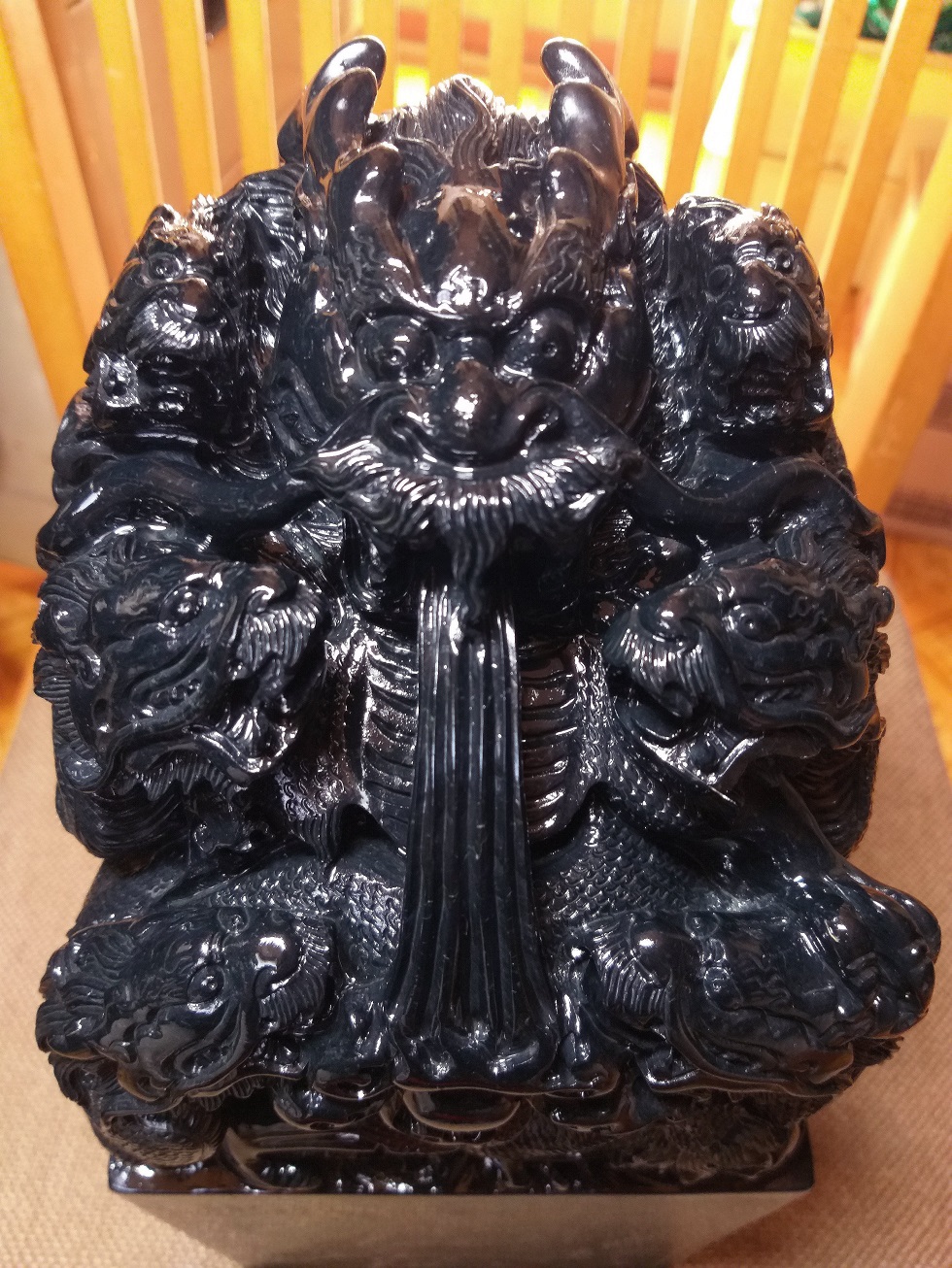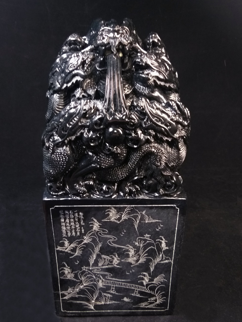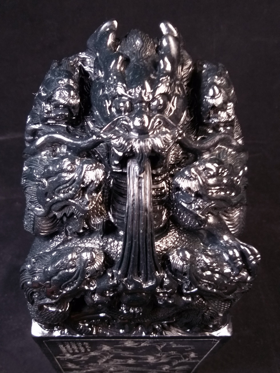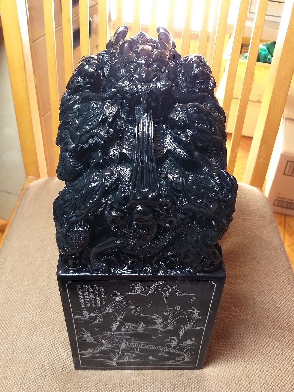 この印材は、実家の者が1930年くらいに、高額で購入した一塊の40KG重さのある最高品質の壽山高山黒碧凍石の石材の六面を切り取り、壽山彫刻の名家に彫刻を依頼した品になります。