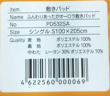 | 商品説明 | 【商品紹介】 * ふわふわ毛布フランネルタイプ、冬用のあったか敷きパッドです! * 四隅ゴムがついておりますので、簡単に敷き布団につけることが出来ます。 * 家庭で丸洗いがOKな商品です! 【商品品質】 * サイズ:100cm×205cm(シングルサイズ) * 表地:ポリエステル100% * 裏地:ポリエステル100% * 詰め物:ポリエステル100% レーヨン30% * 四隅ズレ防止のゴム付き |
