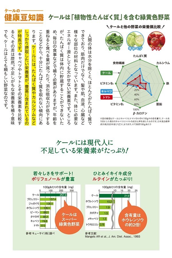 専用スプーン2杯(約14g)あたり(配合時)ビフィズス菌約2億個+乳酸菌約198億個の合計200億個へ増量しました。また、ケールに含まれる食物繊維とオリゴ糖が腸内の善玉菌のエサになり善玉菌を増やし働きをサポートします。偏食やストレス続きの生活にさらされる現代の生活環境には、悪玉菌が優勢になる要因がいっぱい。おのずと乳酸菌の数は減少します。 普段の食生活の中から、乳酸菌を積極的に補うように心がけましょう。