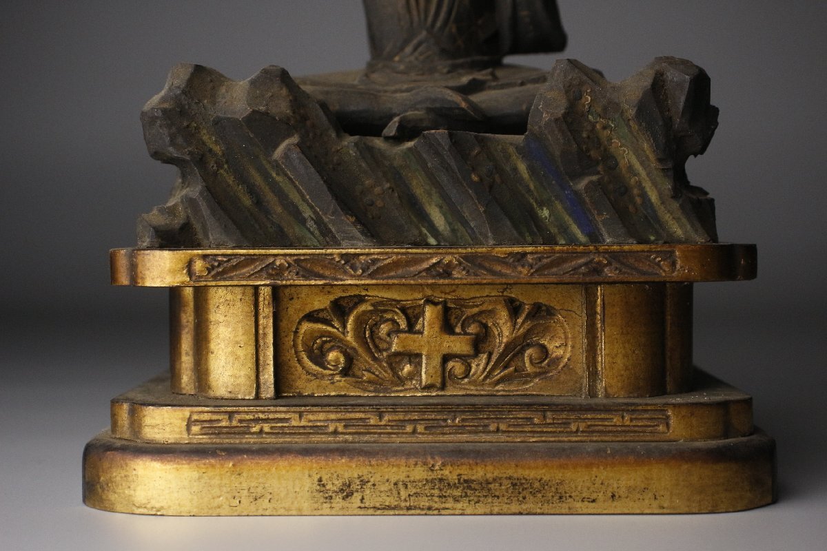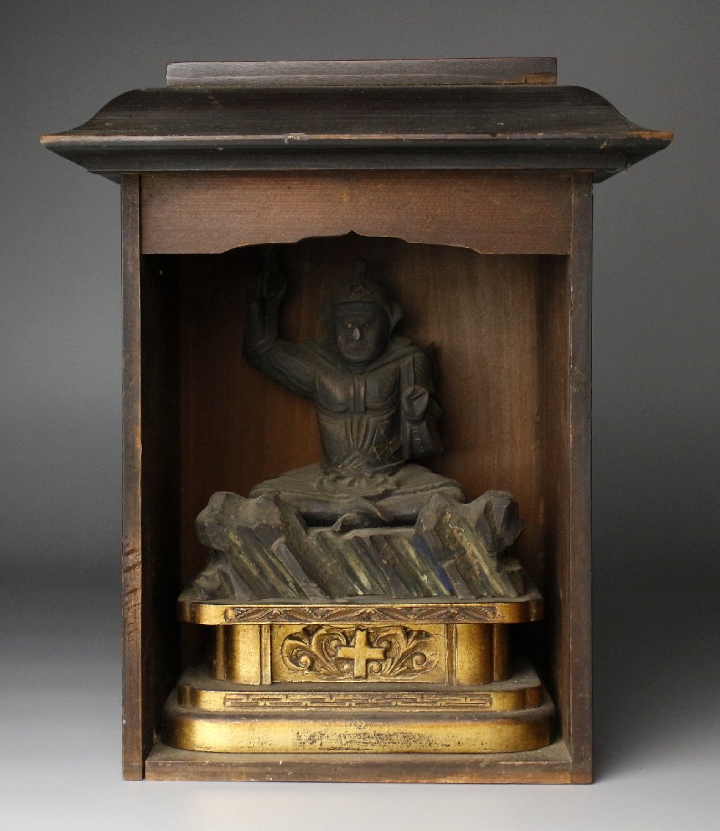 ① [P]25.9 25091701| * * * 商品詳細 * * * ここでしか出逢うことのできない唯一の美をご紹介させて頂きます。 玉眼の瞳が鋭く光る妙見菩薩像のご紹介です。 経年を経た肌地は重厚感があり、堂々たる佇まいに一層の貫禄が感じられます。 台座部分には十字架があり、隠れた信仰が伺えます。 躍動感ある姿と凛々しいお顔、覇気ある逸品を この機会に是非お求めください。 ■商品内容/仏像、厨子 ■サイズ/横12.5㎝×高17㎝×奥行8.5㎝ 厨子:横18.5㎝×高22.5㎝×奥行13.5㎝ ■状態/経年による傷み、スレ、キズ、割れ、持物に欠損、欠け、 厨子にスレ、キズ、欠け、浮き、曲がり、パーツ欠損がございます。 ※写真にてご確認、ご了承の上ご入札下さい。  !かんたん決済  * * * 発送詳細 * * *  入金確認後3営業日以内に発送致します。 ※直接引き取りも可能です。 60~160サイズにつきましては 佐川急便、ゆうパックのどちらかで発送いたします。 ゆうパック発送の場合、弊社の発送日から追跡サービスに問合せ番号が反映されるまで 約1日ほどお時間がかかりますのでご了承下さい。 佐川急便での発送の場合送料は下記のURLにてご確認下さい。 同梱を希望の場合は梱包サイズを測り直し  佐川急便の定価料金としますので  ご了承ください。  * * * 注意事項 * * * 運送中の破損があった場合は速やかに当社までご連絡下さい。  保険を利用するのに受取連絡後に運送会社による現場での破損状況確認が必要となります。  勝手に返送されますと保険の適用外となりますのでご注意ください。 * * * * * * お問い合わせ:082-236-8669 |