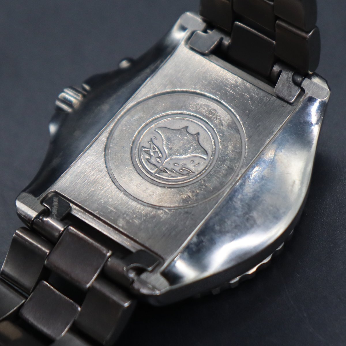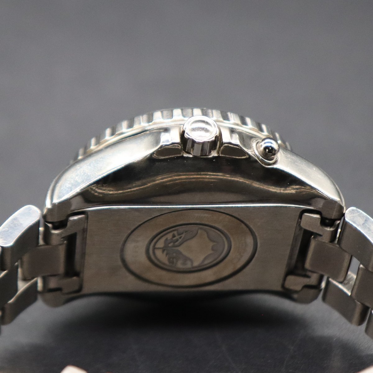 不動のため、またベゼルを回転させると外れてしまうため、 ジャンクでの出品とさせて頂きます。 二次電池残量は不明です。 ねじ込み式リューズをほどき、針が回ることのみ確認しております。 他、ジャンク品ですので詳細は全て未確認です。 全体に経年使用に伴うスレ・小キズ・小汚れ、 ベゼルに小キズございますが、ガラスや文字盤は 目立った傷みなく、きれいかと思います。 裏蓋のマンタ刻印、良好です。 ブレス、スレやタレなど使用感ございます。 ジャンクとして出品しておりますので、 詳しくは画像にてご判断ください。 | |