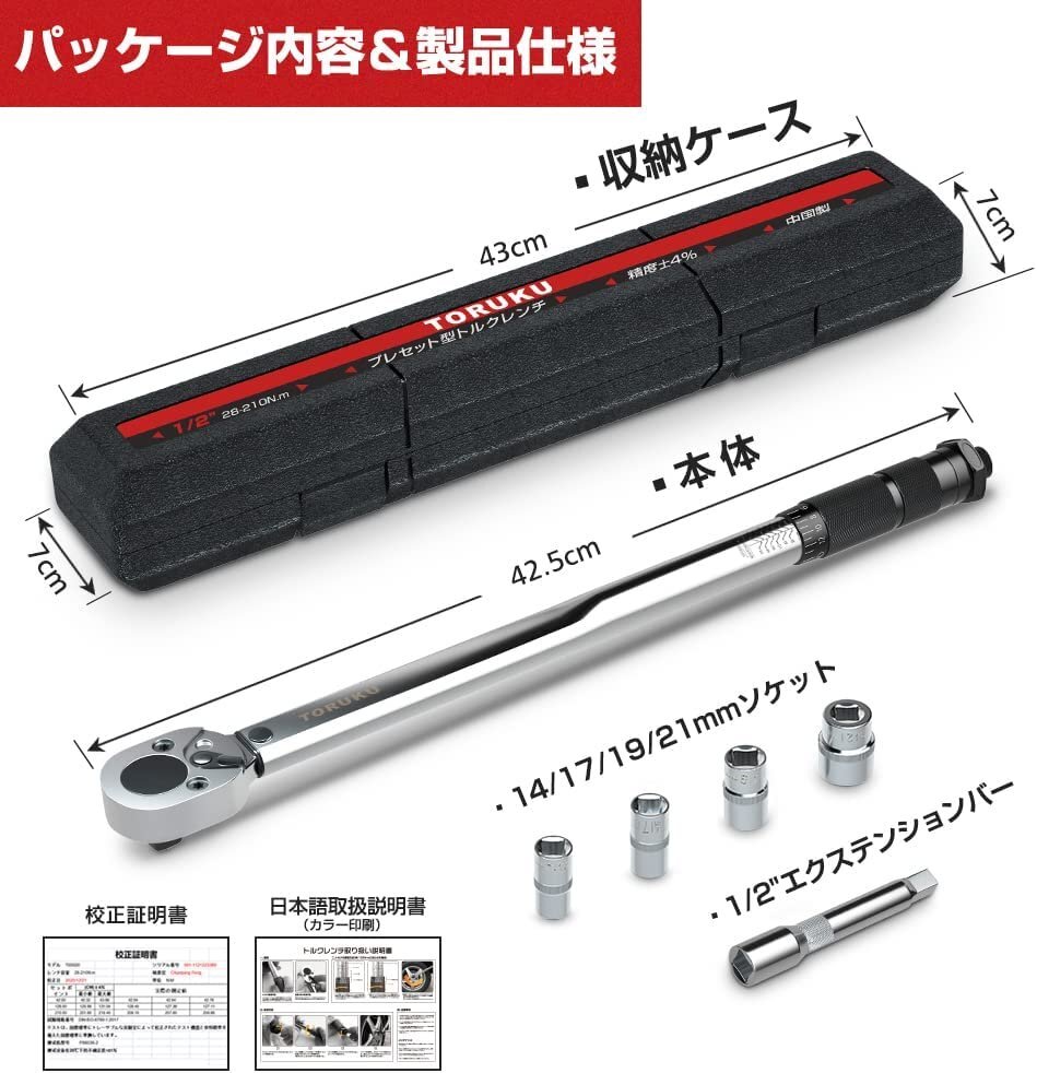 ◆【商品内容】: トルクレンチ本体、アルミホイール対応14/17/19/21mmソケット 差込角: 1/2インチ エクステンションバー。 ◆【信頼性と高精度】: 精度は±4%以内でDIN-ISO-6789(国際標準)を満たします。各レンチには検証コードがあり、日常使用には信頼性が高く正確です。 ◆【正逆転&読みやすいスケール】: 作動トルクの安定性を調整した後、ロックできます。正逆転可能なヘッドなので、非常に便利です。設置目盛もほかのレンチよりもっと高精度、細工も精巧でトルク変更、によって容易に行えます。 ◆【品質保証と使いやすい】: 耐久性の抜群である ◆【本体】: カーボンスチール・スチール / 【ソケット・エクステンションバー】クロームバナジウムを採用し、防錆で十分に丈夫である。ハンドルは防錆および滑り止めのためのナーリングなので、握り心地が良くて、使いやすいです。 ◆【目盛】: はっきりと読みやすい。目盛によってトルク変更は容易に行え! ◆トルク設定範囲:28~210N・m ◆ 密閉構造でホコリの侵入が少なく長期間にわたり高精度を保ちます。 【保証】 ◆当商品は12っヶ月保証となります。 ◆お届けから1週間以内にご連絡のあった不良品の保証対応の送料は当方が負担いたします。 ◆保証期間内の不良品ですが、交換のみ対応しております。往復送料はお客様負担となります。在庫がない時だけ返金しますので、ご了承ください。 |