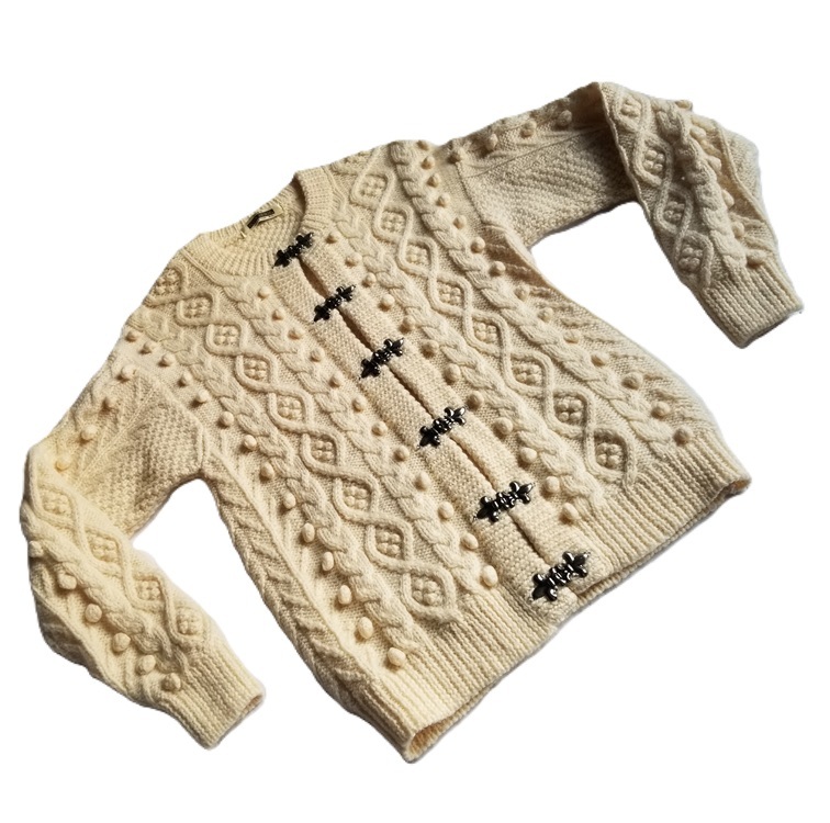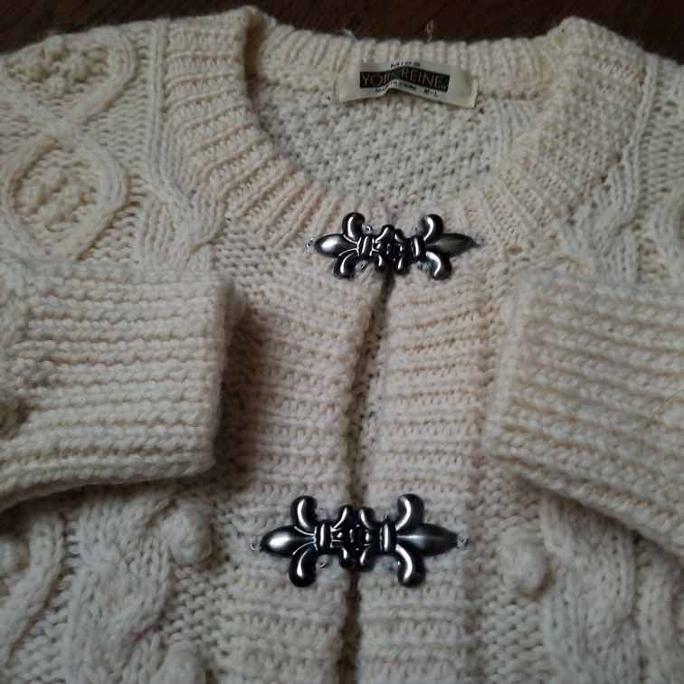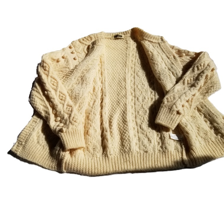 | サイズ表示はM-L。 着丈約63cm・ 胸囲平置き半面約42cm・ スソ幅(胴囲半面)約38cm・ 袖丈(脇下から)約45cm。 袖幅半面約6.5cm・ 腕半面約16cm。 素材はウール100%。 表面は毛羽立っている部分、 素材落ちしている 部分あります。 見落としのあるヨゴレや オリシワなどある事を ご理解下さい。 |