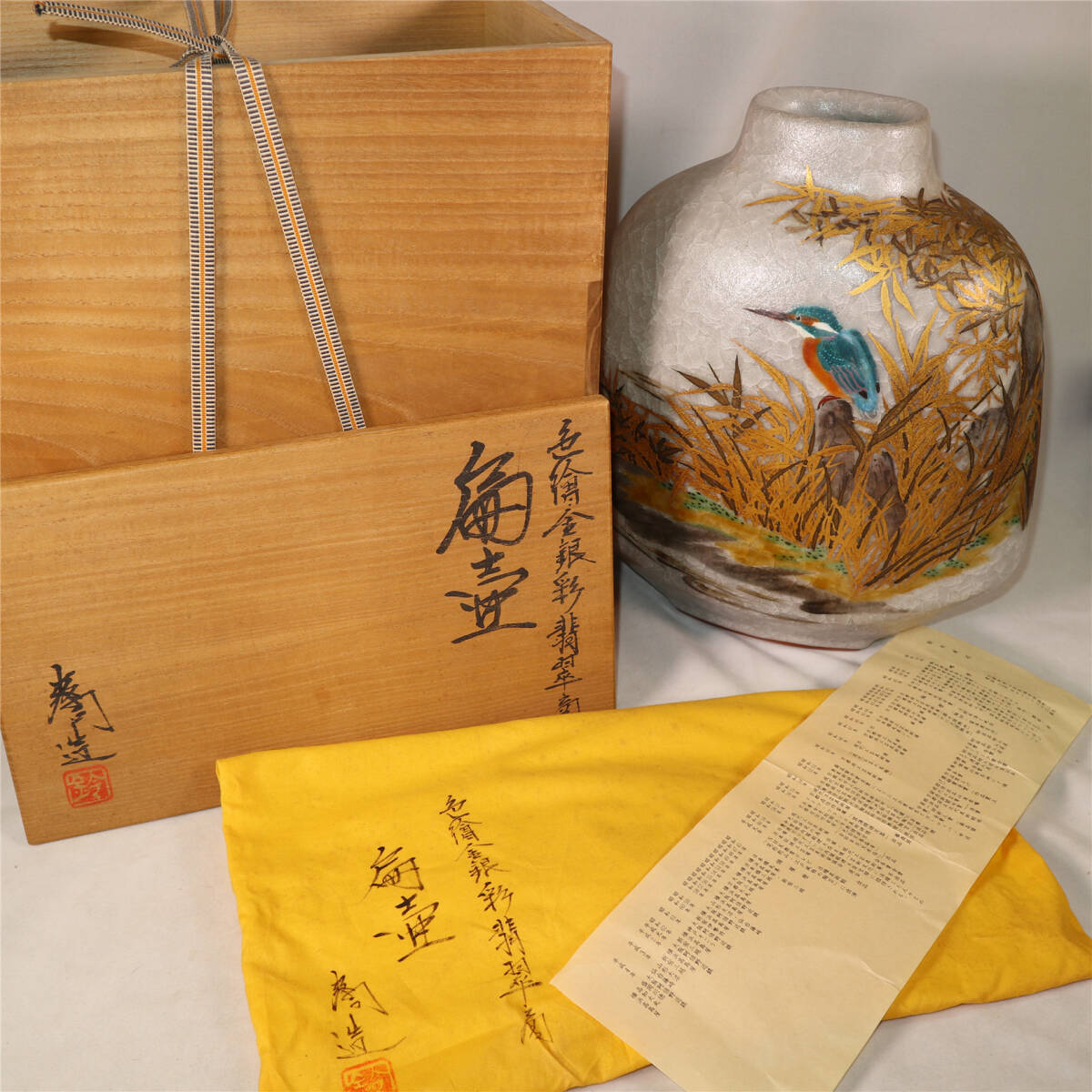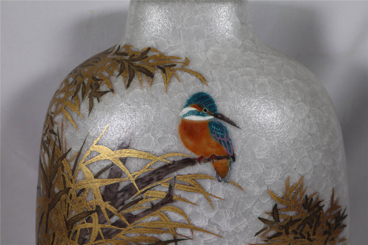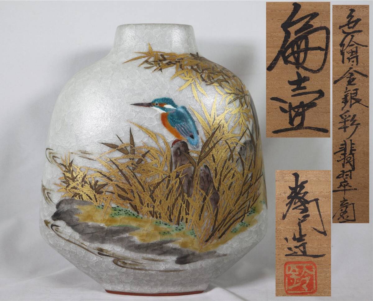 | 鈴木爽司 色絵金銀彩翡翠図扁壷 共箱 共袋 栞 師:富本憲吉 花瓶 花入 |