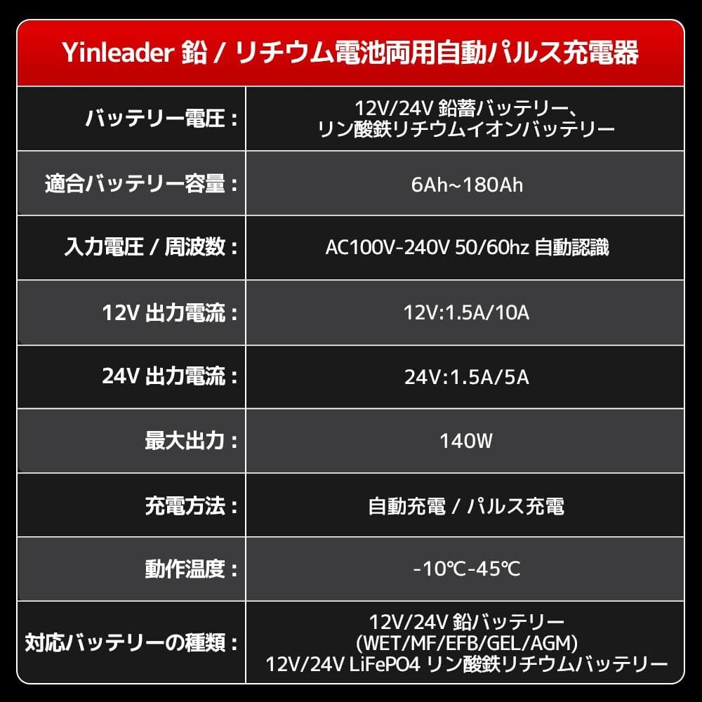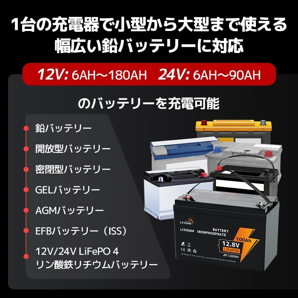 適合バッテリー:DC12V/DC24V (開放型・密閉型・AGM)鉛バッテリー /DC12V/24V LiFePO4 リン酸鉄リチウムバッテリー