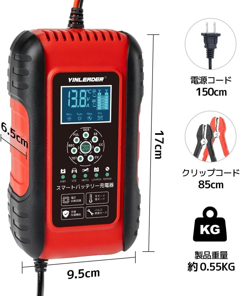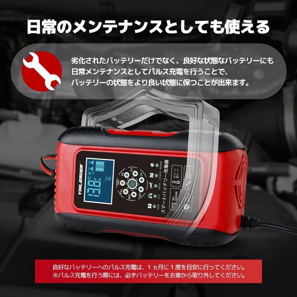 充電機能:7段階全自動スマート充電・バッテリー診断・急速充電・冬夏 スマート充電・パルス修復モード・7段階式充電(パルス充電・ソフトスタート 充電・定電流充電・定電圧充電・テスト充電・補充充電モード・フロート充電モード)