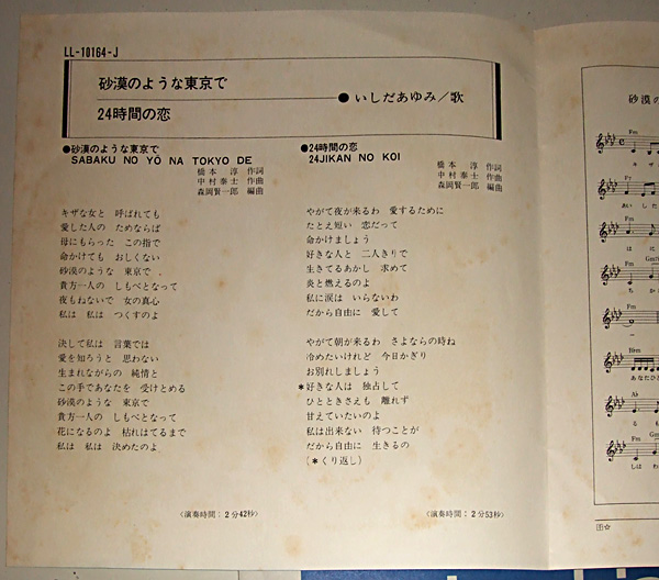 1971年に日本コロムビアから発売されましたいしだあゆみのEPレコードです。(LL-10164-J) 以下色文字曲をクリックするとmp3でご試聴できます。 (概ねこの盤の平均的ノイズレベルとご理解下さい) A 砂漠のような東京で B 24時間の恋 |