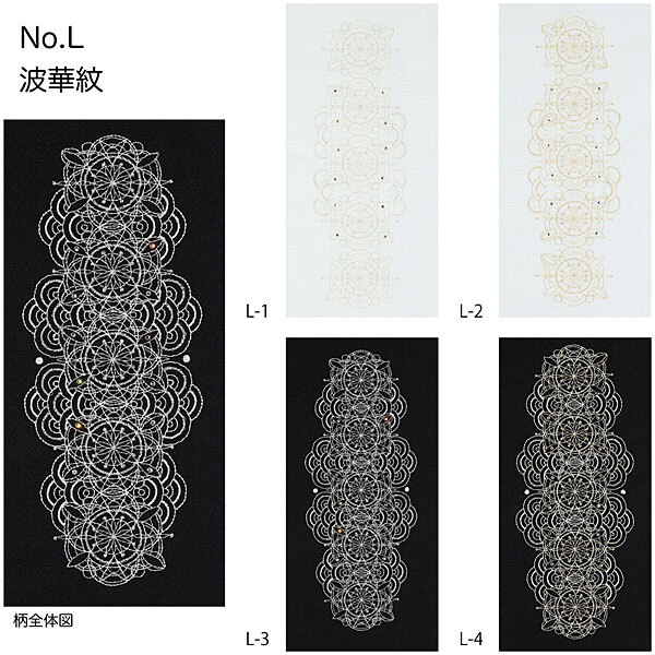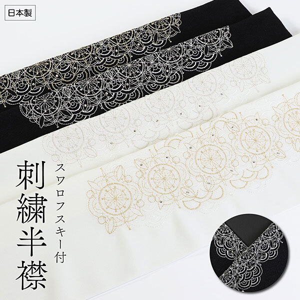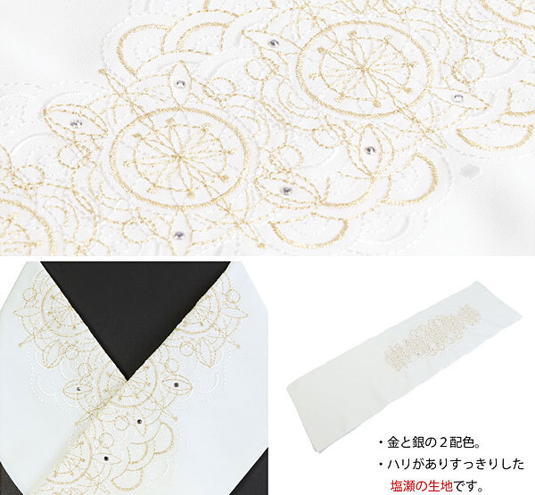 | 選べる4色 刺繍衿 波華紋柄 スワロフスキー付き 白は塩瀬生地、黒はちりめん生地 どちらもスワロフスキーがちりばめられています。 【素材】 日本製 衿地:ポリエステル100% 刺繍糸:レーヨン100% 金属糸使用 刺繍半衿 スワロフスキー ★白地は塩瀬生地 ★黒地はちりめん生地 【色・柄】地色:白色・黒色 L-1 波華紋柄 ホワイト・刺繍ゴールド L-2 波華紋柄 ホワイト・刺繍シルバー L-3 波華紋柄 ブラック・刺繍ゴールド L-4 波華紋柄 ブラック・刺繍シルバー 刺繍:波華紋柄 ※購入時 L-1~L-4の中からご希望の商品記号を ご要望欄よりお知らせください ■配送方法 宅配便/メール便 | ||