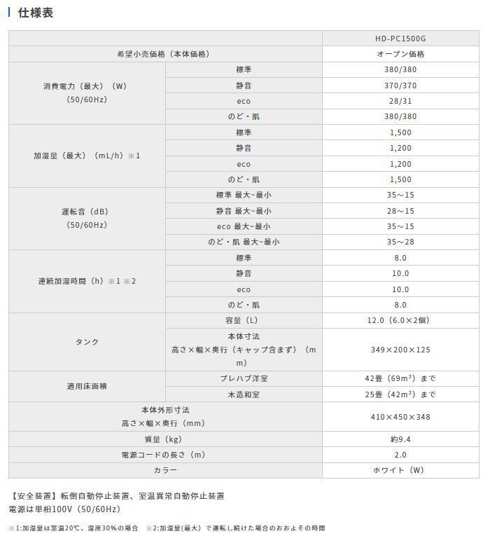 | 適用床面積 木造和室 25畳(42.0平方メートル) プレハブ洋室 42畳(69.0平方メートル) タンク容量 12.0L(6.0L×2個) サイズ:(約)高さ410×幅450×奥行348mm 重量:(約)9.4kg |