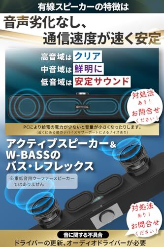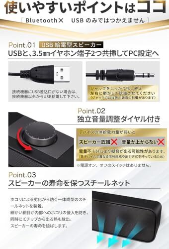 USB給電型スピーカー【★★注意★★】■受信認識の設定必要ですPC設定サウンド出力デバイス【外部USBスピーカーを選択◎、内蔵スピーカー選択は】(ご使用方法)USB給電型スピーカーの為、パソコン、ラップトップやモバイル電源などのUSBポートに接続して電源を供給出来ます。スピーカーから音を出すためには、音源出力はヘッドフォン(イヤホン)3.5mmステレオミニジャックのあるデバイスの音声端子とUSBの両方につなぐと音楽を楽しめます。ボリュームは、手軽に音量を調節できます(ノイズ割れ、本体振動を防ぐためにボリュームMAXは適しておりません)又、音が出にくい症状などご座いましたら、USBやジャックの差込口の入れ直し、使用機器の再起動など行ってください。しっかり奥まで入っていないと正常に認識されず、雑音、不認識の原因になりますのでご注意ください。使用機器によっては、適合しにくい又は認識しないものもあります。※※※使用機器(デバイス)によって本来の製品の能力を十分に出せないこともあります(供給電量が弱い、小さいなど)適合についてなんでも対応しますので問い合わせください!