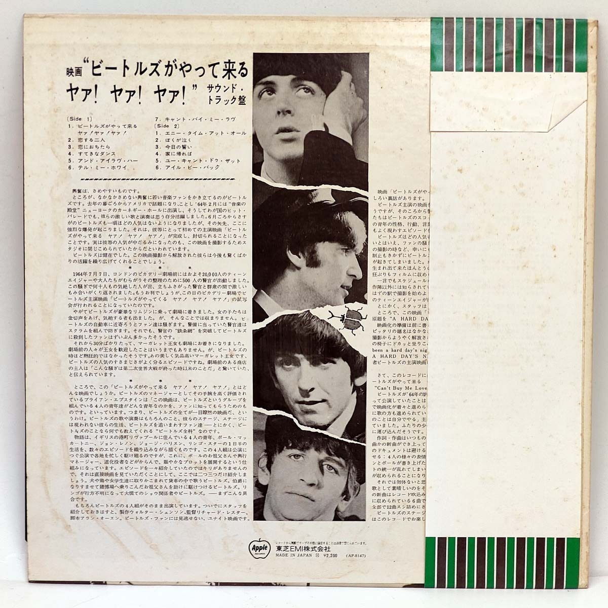 中古 アナログレコード LP ビートルズ A Hard day's NiGhT STEREO AP-8147 下記はOCRで文字起こししたものです。 誤識字等あるかもしれませんので、その点は差し引いてご参考ください。 ----------------------------- 映画は音楽を変え、音楽は映画を変える。 視と聴を初めて密着させたビートルズのサントラ傑作 「ビートルズがやって来る ヤア!ヤア!ヤア!」 サウンド・トラック盤 A) 1. ビートルズがやって来る 2. 恋する二人 3. 恋におちたら 4. すてきなダンス 5.アンド・アイ・ラヴ・ハー 6.テル・ミー・ホワイ 7. キャント・バイ・ミー・ラヴ B) 1.エニイタイム・アット・ オール 2. ぼくが泣く 3. 今日の誓い 4. 家に帰れば 5. ユー・キャント・ドゥ・ ザット 6.アイル・ビー・バック THE BEATLES FOREVER STEREO AP-8147 ----------------------------- 動作確認や再生チェックはしていません。 不具合があるという認識はありませんが 状態・状況にかかわらず返品・返金不可とします。 これをご了解いただいた方のみご入札ください。 [特記事項]梱包のため、お支払いから発送まで最大5日程度の日数をいただく場合があります。 ただいま中古アナログレコードを順次出品しています。 まとめて取引(同梱発送)歓迎。 ----------------------------------------- ■この商品は下記の配送方法に対応します。 複数落札や他商品と同梱の際は、その都度お見積もりします。 ●ヤマト運輸 宅急便 元払 ・北海道:1,700円 ・青森/岩手/秋田県:1,300円 ・宮城/山形県/~この間の地域すべて~/三重/岐阜/福井県:1,150円 ・滋賀/京都府/大阪府/兵庫/奈良/和歌山県:1,300円 ・岡山/鳥取/広島/島根/山口/四国各県:1,450円 ・九州各県:1,700円 ・沖縄県:2,070円 ○宅急便の配達日時の指定は、希望通りにならない可能性をご了承の上でお受けします。 ただし天候や交通事情等により、100%の確約はできません。 指定できる時間帯 (指定なし, 8-12, 14-16, 16-18, 18-20, 19-21時) ・お届けの際に受領印が必要です (宅配BOX等があれば、この限りではありません) ●佐川急便 飛脚宅配便 元払 ・北海道:1,300円 ・青森/岩手/秋田:1,000円 ・宮城/山形/~この間の地域すべて~/三重/岐阜/福井:900円 ・京都/滋賀/奈良/和歌山/大阪/兵庫:1,000円 ・岡山/広島/山口/鳥取/島根:1,100円 ・四国各県:1,200円 ・九州各県:1,300円 ・沖縄県:3520円以上 (宛先によって中継料金を加算) ・離島や沖縄県宛は上記料金に加えて中継料金が別途加算される場合があります。 ・お届けの際に受領印が必要です (宅配BOX等があれば、この限りではありません) ●日本郵便 普通郵便 : 750円 ・配達日時や配達期限は指定できません ・配送日数 1週間~10日 ・受取人様宅の郵便受に配達(投函)されます。受領印は不要 ・紛失・破損等(初期不良が疑われる場合も含む)あっても補償はありません |