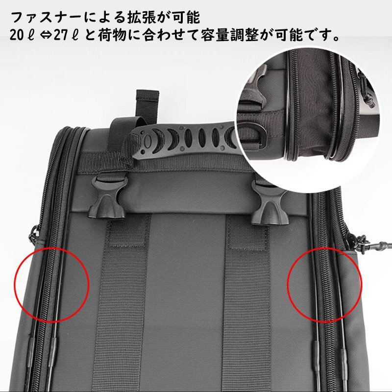 【大容量 実用性を追求した バイク バッグ 】20L~27Lへと容量拡張が可能。 更に上部のベルトを使ってテントなどをしっかり止められる。滑りにくい素材でバッグもズレにくい。