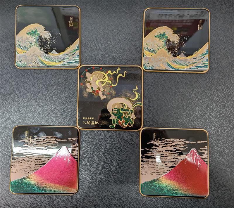 | #14730 【<未使用美品> 航空自衛隊入間基地 袋付き コースターセット!(^_-)-☆】 入間基地コースター 漆芸 航空自衛隊 自衛隊 5個セット | ||