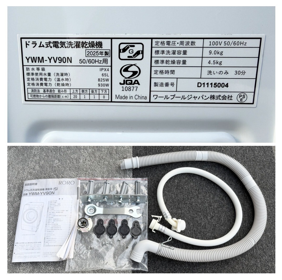 【婀】② 美品 YAMADA ヤマダ RORO ドラム式 電気洗濯乾燥機 YWM-YV90N 2025年製 洗濯9kg 乾燥4.5kg パワフル 自動お掃除 温水洗浄 K7CGC