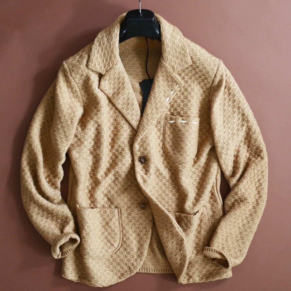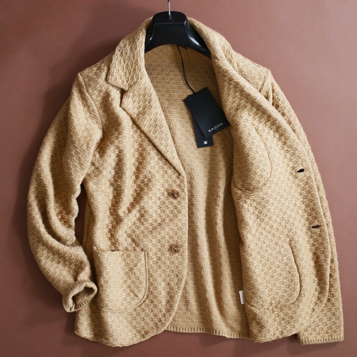 ●イタリア・ナポリ発、ボローニャ拠点のブランド「エクサゴン・イタリー・ジェントルマン」より、襟とポケット部分の手仕事によるホワイトステッチがワンポイントとなった、ラグジュアリーな編み模様のニットジャケットです。イタリアらしい柔らかなニュアンスとクラフツマンシップが調和した、2025-26秋冬コレクションの新作となっております。カーディガンのように軽やかでありながら、テーラードジャケットのような構築的フォルムが特徴で、大人の上品なリラックススタイルに最適です。 ●生地には立体的な表情を生み出す独特なニット地を採用。丁寧に編み上げられた凹凸のある織り柄が、光の加減によって陰影を生み、奥行きのあるテクスチャを感じさせます。柔らかく伸縮性のある素材感で、軽やかに羽織れる心地よい着用感。見た目にも暖かく、秋口から冬本番まで快適にお召しいただけます。 ●フロントは2ボタン仕様で、ラペルジャケットのようにエレガントな佇まいを演出。胸ポケットと両サイドのパッチポケットは実用性にも優れ、デザイン性と利便性を両立しています。襟やポケットに施されたハンドステッチがさりげなくアクセントとなり、クラシックな雰囲気の中にモダンな抜け感をプラスしています。 ●シャツやタートルネックとの相性も良く、ジャケット感覚で着用できるため、オフィスカジュアルから週末のリラックススタイルまで幅広く対応。細部までこだわり抜かれたイタリア製の品質が、他にはない上質感を漂わせます。 ●色:キャメルベージュ系 ●ポケットあり。伸縮性あり。 ●イタリア製 ●色:キャメル系 ●素材:ウール30% ポリエステル70% ●サイズ:S L XXLの中から、お選びいただけます。*ご落札後、取引連絡よりご希望のサイズをお申し付け下さい(後の変更・交換・キャンセルは一切して頂けません)。ご落札後、24時間以内のご連絡の程お願い申し上げます。*下記詳細サイズもご確認の上、よろしくお願いいたします。 ●詳細サイズ(cm)置いた状態で: S *イタリアサイズ46相当。日本サイズ概ねMサイズ辺りとなりますが、着用時の伸縮により比較的多くの方に適応頂けそうです。下記詳細サイズもご確認の上、よろしくお願いいたします。 肩幅:43(右肩端~左肩端の直線距離) 身幅:52*着用時伸縮します(右脇下~左脇下の直線距離) 袖丈:62(肩の縫い目~袖先) 着丈:65(襟の付け根~裾まで。襟の幅を含んでいません) L *イタリアサイズ50相当。48の方はこちらをお選びください。日本サイズ概ねLサイズ辺りとなりますが、着用時の伸縮により比較的多くの方に適応頂けそうです。下記詳細サイズもご確認の上、よろしくお願いいたします。 肩幅:46(右肩端~左肩端の直線距離) 身幅:55*着用時伸縮します(右脇下~左脇下の直線距離) 袖丈:62(肩の縫い目~袖先) 着丈:67(襟の付け根~裾まで。襟の幅を含んでいません) XXL *イタリアサイズ54相当。52の方はこちらをお選びください。日本サイズ概ねXXLサイズ辺りとなりますが、着用時の伸縮により比較的多くの方に適応頂けそうです。下記詳細サイズもご確認の上、よろしくお願いいたします。 肩幅:49(右肩端~左肩端の直線距離) 身幅:59*着用時伸縮します(右脇下~左脇下の直線距離) 袖丈:62(肩の縫い目~袖先) 着丈:72(襟の付け根~裾まで。襟の幅を含んでいません) 詳細サイズご参考 ※大よその採寸となります。 ※ご落札後取引ナビよりサイズご相談頂くことが無いよう、サイズは事前のお決め頂いた上よろしくお願い致します。 ※ご落札後、ご希望サイズを取引ナビより、必ずお知らせ下さいませ。ご落札後24時間以内を経過後、ご希望サイズをいただけない場合は、取引のキャンセルもしくは、こちらにて任意のサイズにて選択させていただくことがございます(その場合も後のサイズ変更・交換・キャンセルは一切して頂けません)。 ※お品物はタイトルにございますもののみとなり、着合わせのお洋服や小物などがございましても、それらは含まれません。 ※素材の特性上、多少のことはご容赦くださいませ。 ※ご質問は、必ずご入札前にお願いいたします。(ご入札後、ご落札後の取引ナビからのご質問はお避け下さい) ☆☆☆ご連絡・お支払い(かんたん決済)☆☆☆ ご落札後24時間以内に、取引ナビからご連絡(お名前・ご住所全て。*サイズ選択いただけるオークションはサイズのご連絡も含め)・かんたん決済可能な方。 *銀行振込の場合は翌営業日、コンビニ決済はご落札後2日目の午前中まで、お支払いをお済ませ下さいませ。 電話応対は、一切致しておりません。取引ナビをご利用下さい。 ☆☆☆受け取り連絡☆☆☆ 製品到着後24時間以内。*出来る限り、到着日当日に受け取り連絡頂きましたら幸いです。 *配達日指定ご希望の際は、ご落札後、最長4日以内に「受取連絡」ができるようお願いします。(北海道・沖縄・離島の方は5日以内) *特別に記載をしました際には、そちらを優先させていただきます。 ☆☆☆同日に2点以上のご落札の場合☆☆☆
