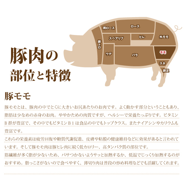 ホエイ豚:牛乳からチーズを作る時に副産物としてできる"ホエイ(乳清)"を飲ませて育てた豚。風味のよさ、やわらかさが特徴です。 豚モモとは、豚肉の中でとくに大きいお尻あたりのお肉です。よく動かす部分ということもあり、脂肪は少なめの赤身のお肉。ややかための肉質ですが、ヘルシーで栄養たっぷりです。ビタミンB群が豊富で、その中でもビタミンB1は食品の中でもトップクラス。またナイアシンやカリウムも豊富です。これらの栄養素は疲労回復や糖質代謝促進、皮膚や粘膜の健康維持などに効果があると言われています。そして豚モモ肉は豚ヒレ肉に続く低カロリー、高タンパク質の部位です。筋繊維が多く脂が少ないため、パサつかないようサッと加熱するか、低温でじっくり加熱するのがおすすめ。脂っこさがないので食べやすく、薄切り肉は普段の炒め料理などでも活躍してくれます。 ※梱包時の真空処理の過程で一時的に肉の赤みが変色致しますが、真空パック開封後15分ほど経過後には元の赤みを取り戻しますのでご安心下さいませ。 |