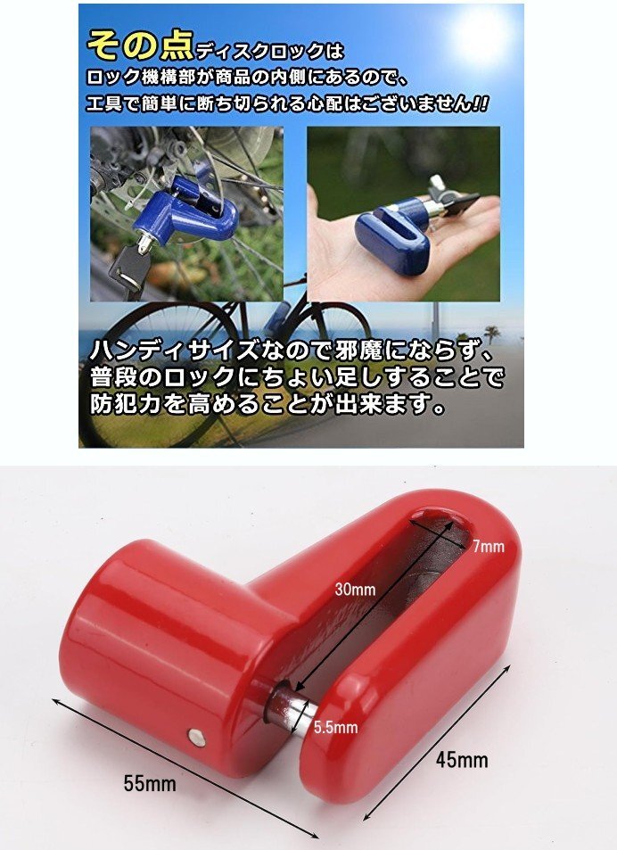 | ディスクに装着してタイヤの回転をガッチリロック!!防犯力を高めるディスクロックの登場!! ◆チェーンタイプやワイヤータイプなど、自転車のロックは硬鋼線カッターなどの工具で簡単に切られてしまう可能性があります。 ◆ディスクロックはロック機構部が商品の内側にあるので、工具で簡単に断ち切られる心配はございません!! ◆キータイプの簡単取付、ハンディサイズなので邪魔にならず、普段のロックにちょい足しすることで防犯力を高めることが出来ます。 |