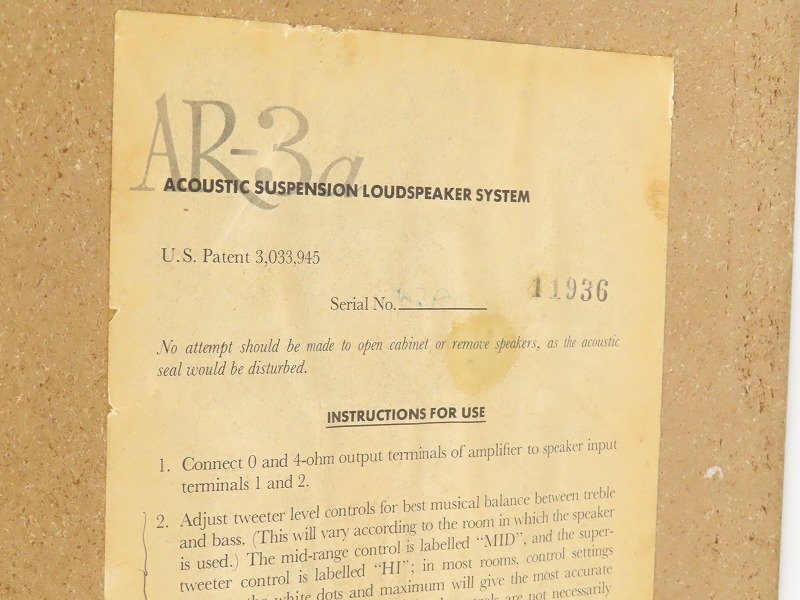 ■メーカー : Acoustic Research ■型番 : AR-3a ■外径寸法 : W355×H635×D290mm ■重量 : 21.5kg ※弊社実測の為、多少の誤差はご了承下さい。 ※ペアでの出品となります。 【商品の状態 当店での確認内容】 動作確認をしたところ、LOWは問題ございませんが左右共にMID/HIGHは出音が確認出来ません。 ※上記により【難あり商品】としての出品となります。 「商品の状態」に関しましては当方主観の目安となります。外観などは中古品で個人差もありますので詳細は画像にてご判断ください。 画像にて不明な点はご質問下さい。 出品商品は画像のものですべてになります。画像に写っているもの以外は付属いたしません。 ※注意※ のシステム上、送料表記が送料未定となっておりますが、送料に関しては全て有償となりますので下記を参照下さい。 【送料 全国一律 7,200 円 沖縄、離島は別途お見積り】 ※送料がお得になるサービスです(下取りシステムのご案内です) ストア決済利用時にクレジットカードやPayPay残高/PayPayクレジットを利用の方は留意点がございますのでこちらを参照上ご利用ください。 当ストアでは商品を安全にお届け出来るよう提携運送会社と協議の上、発泡緩衝材や強度段ボールの使用等 運送会社が指定する梱包方法や資材を採用しております。 より安全にお届け出来るよう商品仕様により梱包サイズが大きくなる場合や個口数が増える事がございます。 【当ストアオークションルールを入札前に必ずご確認ください。】 【落札後の取引手順】 ・落札後は取引ナビにて、必要事項をご入力後、送信ください。 取引終了後48時間(土、日は除く)以内に入力をお願い致します。 ※ご連絡が頂けない場合は落札者様都合でのキャンセルとさせていただきます。 ・落札代金(商品代金+消費税+送料)の入金をお願い致します。 ※大型商品の場合は送料確定後の決済となる為取引ナビを入力頂き、当ストアより送料のご案内が来るまでお待ちください。(土曜、日曜、祝日の場合は翌営業日より順次ご案内いたします) ・お支払い方法はクレジットカード/PayPay残高/PayPayクレジット/PayPay銀行/ゆうちょ銀行のみです。 ※商品代金引換(代引き)のお取り扱いはしておりません。 ※領収証の発行が必要な方はご連絡ください。 ※銀行振込の際の振込手数料はご負担願います。 ・入金確認後に出荷手配を致します。 (原則入金確認後3営業日以内に発送いたしますが、大型や重量のある製品はお時間をいただく場合もございます。) ・発送は当店指定の運送会社の元払いのみでの発送となります。 ※他の運送会社、送料代引き等は致しかねます。 ※落札者様ご自身での運送会社の手配いただく事も可能ですが荷物事故の責任の所在の問題上、梱包は致しかねます。 ※店頭にお越し頂き手渡しも可能(福岡市早良区)です。ご希望の方はご落札後にご連絡下さい。 ・大型/重量物商品の送料につきましては商品の特性上、荷降ろし状況等により送料が大きく前後し運送業者に別途見積りが必要な為、早めのお問い合わせにてお見積り上、入札をお願い致します。 【初期不良の保証について】 ・商品到着後の初期動作不良、また配送中の事故による破損、不具合が有る場合は、商品発送後10日以内に当ストアまでご連絡ください。当ストアでは修理での対応を優先させて頂きますが、修理不可の場合は全額返金させて頂きます。 (商品代金+消費税+送料のお支払い頂いた金額となります) 【初期不良の保証の対象外について】 次の場合は保証の対象外となりますのご留意ください ・ジャンク商品、現状商品、難あり商品での出品商品。 ※難あり商品に関しましては動作確認時に一部動作不良が確認された商品になり、記載している動作確認以外にも、動作不良がある可能性もございます。こちらに関しましても保証対象外となりますことをご理解ください。 ・年代物のオーディオなどで、当店にてわからない範囲で部品が交換されている場合 ・楽器類の特殊機材(マイクロスコープ等)での確認までは行っておりません。気になる方は事前にご質問いただくか、入札をお控えください。 ※初期不良に関しましては【商品の状態】に記載のもの、またそれによって起因する動作不良は対象外です。 ※商品発送後10日を過ぎてのご連絡は対応が出来ませんので、商品が到着しましたらお早めに確認をお願い致します。 【メーカー保証の加入・継承】 ・未使用品、展示品やメーカー保証期間が残っている商品に関しまして、メーカー保証の加入、継承が必要な方は、落札後取引ナビ内にて当ストアにお知らせください。商品発送までにご連絡いただけない場合、メーカー保証の手続きを承れない場合があります。 【評価について】 ・評価不要の場合、必ず取引ナビの「要望欄」にてお知らせください。それ以外でご連絡をいただいた場合、対応できない可能性がございます。一度行った評価はシステム上取り消しが行えませんのでご了承ください。 【入札削除・キ