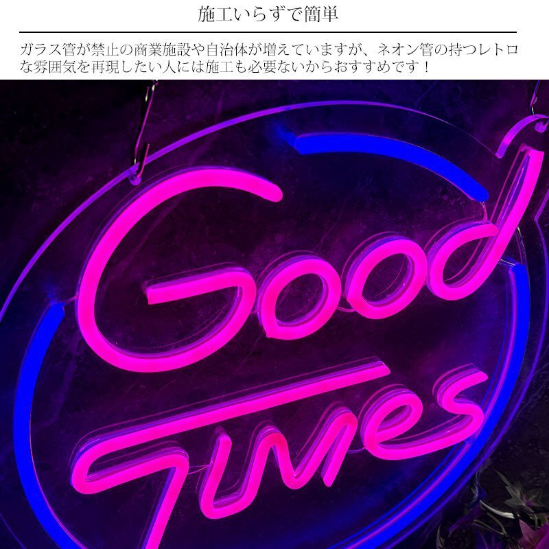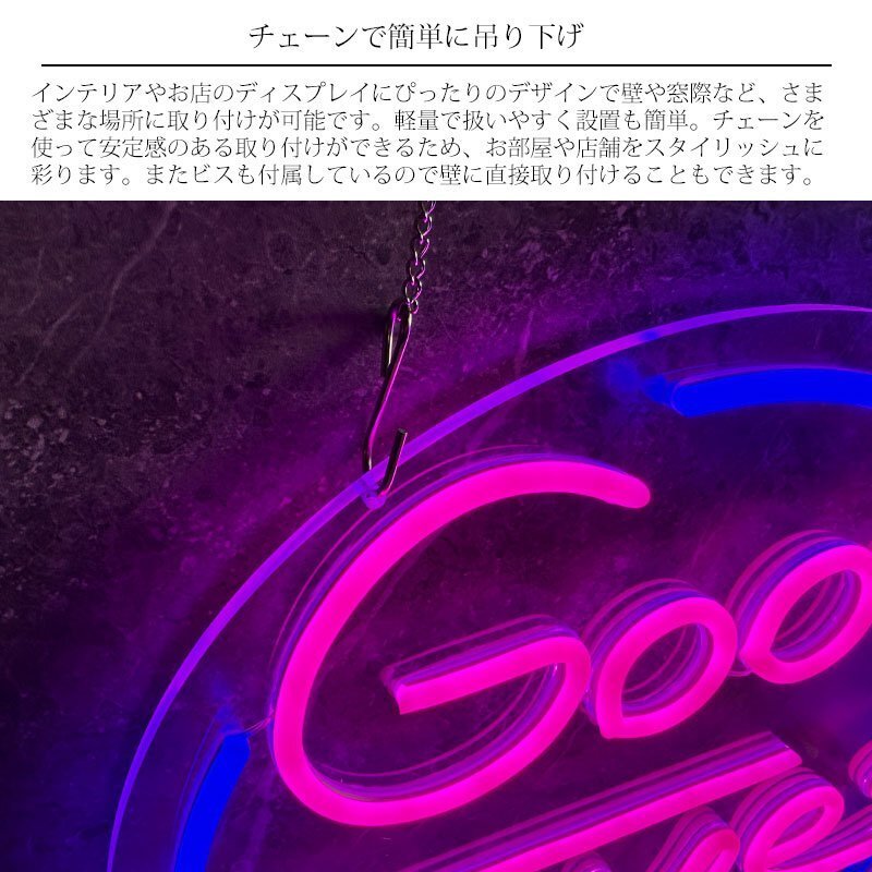 LEDを使用したネオンライト「GoodTime」サインです。 透明なアクリル板にカラフルなLEDライトを埋め込み、鮮やかに光るデザインが特徴です。 チェーンで簡単に吊り下げることができるLEDネオン看板です。 インテリアやお店のディスプレイにぴったりのデザインで壁や窓際など、さまざまな場所に取り付けが可能です。 軽量で扱いやすく、設置も簡単。チェーンを使って安定感のある取り付けができるため、お部屋や店舗をスタイリッシュに彩ります。 省エネ設計でありながら明るく視認性が高いため、昼夜問わず視覚的なインパクトを与えます。 ネオン管特有のレトロ感と、現代的なLED技術を組み合わせたスタイリッシュなアイテムです。 USBで簡単に電源供給が可能です。USBポートに接続するだけで使用できるので、電源の場所を選ばず手軽に設置できます。 また、電源スイッチが付いているため、必要に応じてワンタッチで点灯・消灯が可能です。手軽にON/OFF操作ができるため、日常使いにも便利です。 ■商品詳細 サイズ(約):高さ34cm、幅34cm、奥行き0.6cm チェーン長さ(約):53cm 重さ(約):600g 材質:アクリル板 ※アクリル板にフィルムが貼っていますので剥がしてお使いください。 注意事項 ※商品のカラーにつきましては、お使いのモニターの設定などによって実物と異なる場合があります。 ・この商品は海外からの輸入品の為予告なく仕様など変更する場合が御座います。 ・輸入品の為、傷や塗装の剥がれ、多少の歪み等ある場合がございますのでご了承願います。 ・この商品は専用の箱がない為、簡易梱包、エアークッションでの発送となります ・万が一、当製品を使用した事で損害などが発生いたしましても責任は負いかねますのでご了承下さい。 |